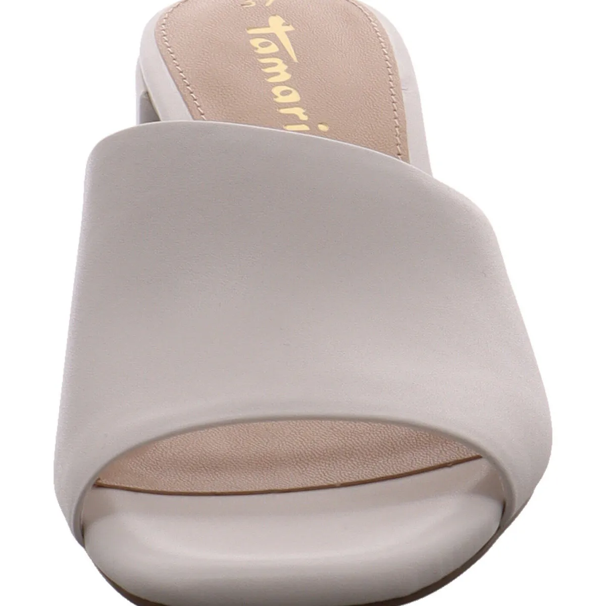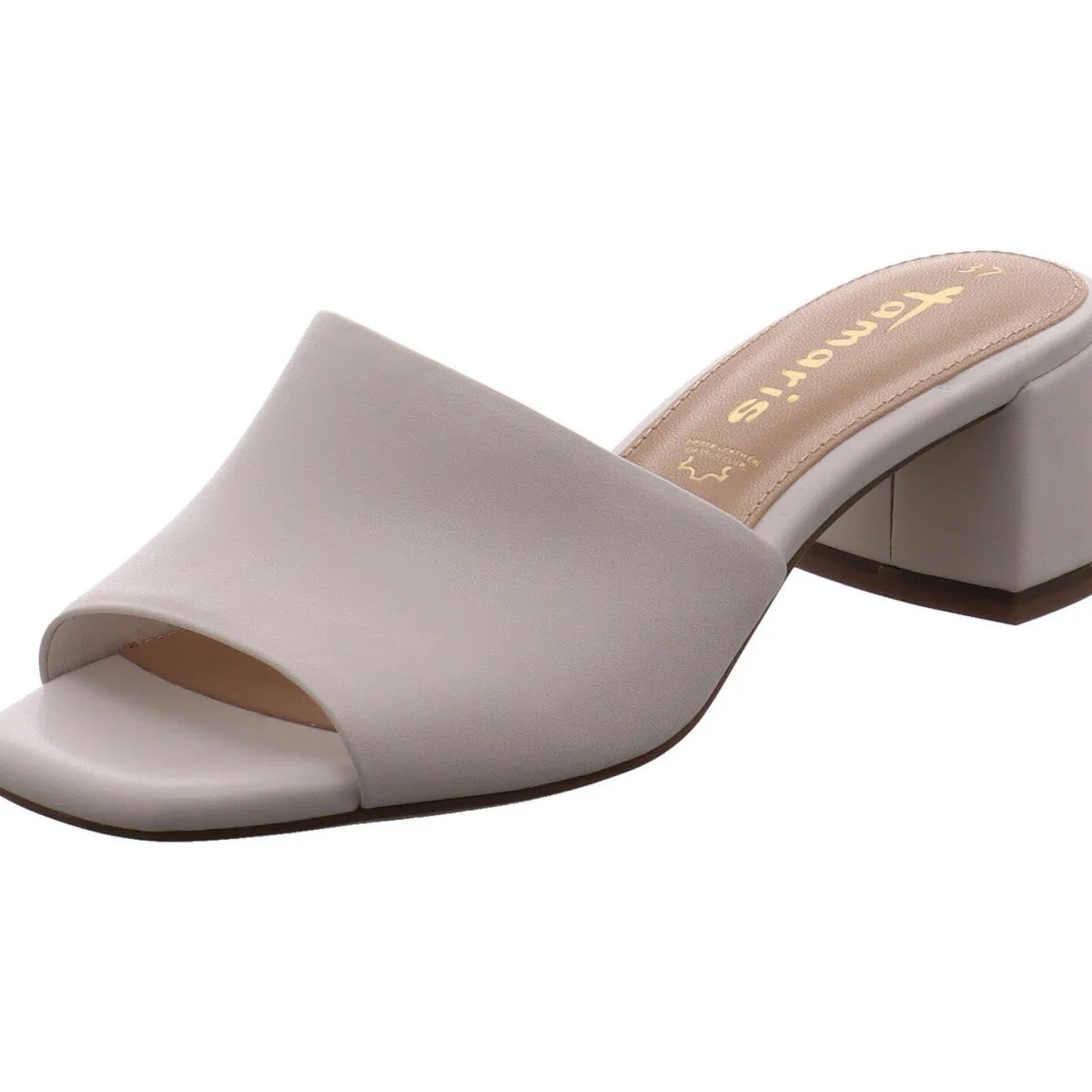 Das schlichte Design aus Echtleder in Creme Weiß wird durch den markanten Blockabsatz und die elegante Schnittführung gekonnt in Szene gesetzt.