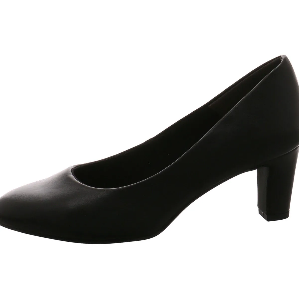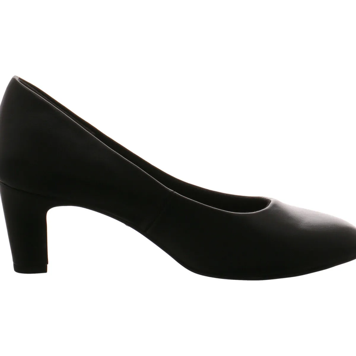Gefertigt aus Kunstleder in Schwarz ist er mit einem Trichterabsatz in angenehmer Höhe gefertigt der lange Beine zaubert.