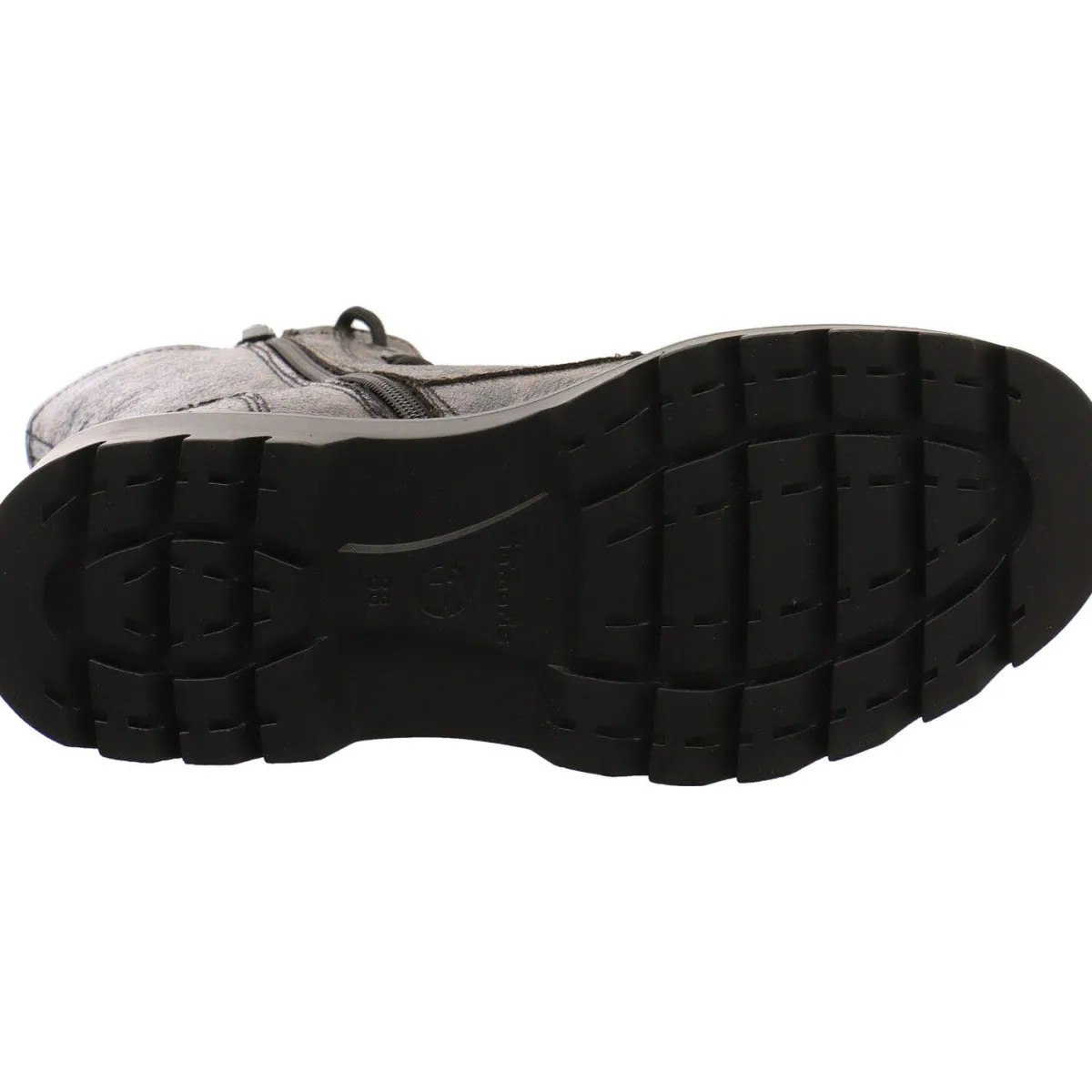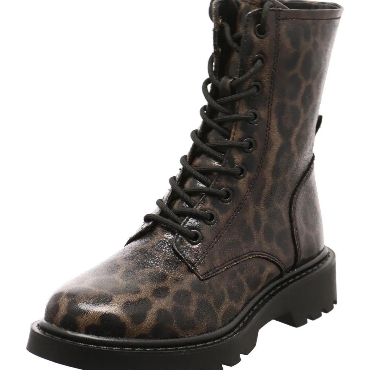 Durch den seitlichen Reißverschluss, ist der Einstieg ganz einfach und mit der Schnürung kann der Schuh optimal an den Fuß angepasst werden. Der Schaft ist höher gearbeitet und schmal. So kannst du den Schuh auch super zu einem angesagt Rock kombinieren.