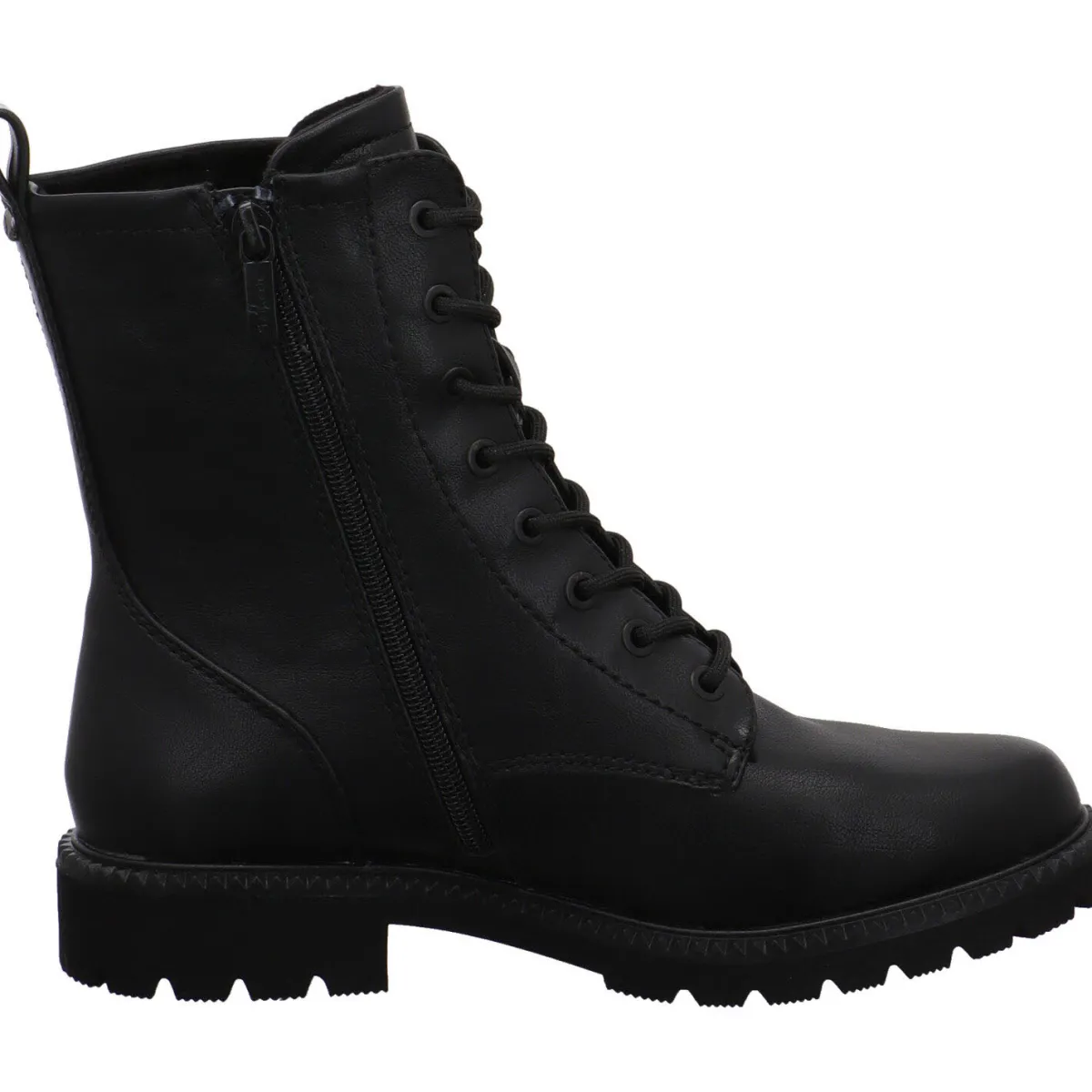 Sie wurde aus Kunstleder in Schwarz gearbeitet. Dank der Lasche am Schaft und dem seitlichen Reißverschluss ist der Einstieg ganz einfach. Mit der Schnürung kannst du sie genau auf deine Bedürfnisse anpassen. Das Innenfutter ist leicht angeraut und die Innensohle angenehm weich. Ideal also für kühlere Herbst Tage.