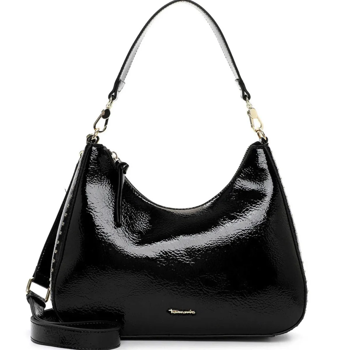 Das große Hauptfach verstaut alle Dinge, auf die du im Alltag nicht verzichten möchtest. Das glänzende Obermaterial mit Lack Finish in Verbindung mit den angesagten Nieten in Gold machen sie zum absoluten Trendsetter.
