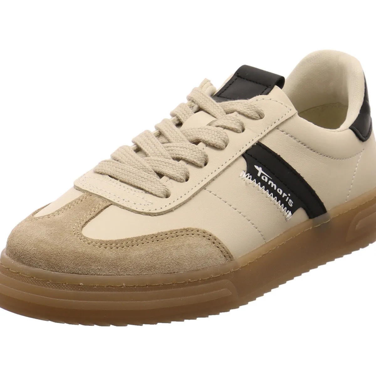 Gefertigt aus Echtleder, besticht das Obermaterial mit seiner tollen Farbkombination, mit hellem und dunklem Beige und Akzenten in Schwarz.