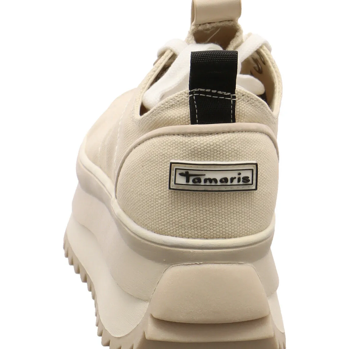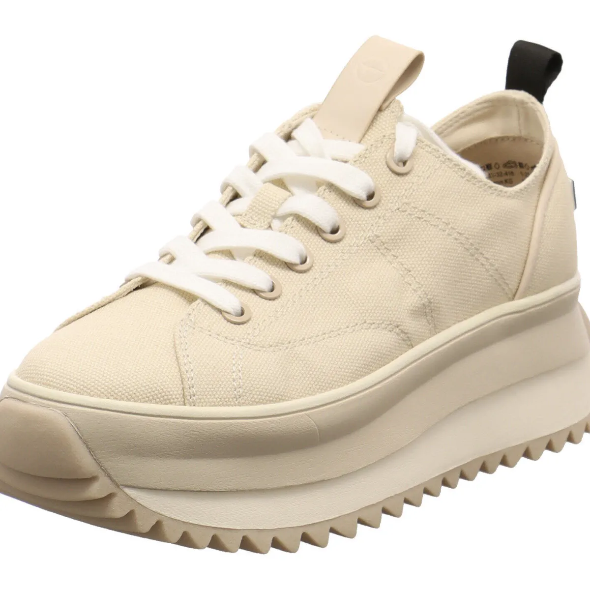 Das absolute Highlight ist die 5,5 cm dicke Plateausohle in Beige und das besondere Profil der Laufsohle. Abgerundet wird das Design durch Ziernähte, die Schnürung in Beige und das Tamaris Markenlogo an der Ferse. DasTextilband am Schaft in Schwarz ist eine tolle Einstiegshilfe und durch die Schnürung kann der Sneaker individuell an den Fuß angepasst werden. Durch das softe Touch It Fußbett, welches sich nach kurzer Tragedauer an den Fuß anpasst, ist der Schuh sehr komfortabel zu tragen.