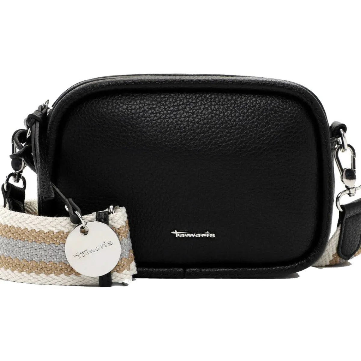 Edel verarbeitetes Kunstleder in Schwarz wurde mit einer angenehmen Haptik versehen, die der Handtasche das gewisse Etwas verleiht. Durch den verstellbaren und abnehmbaren Umhängegurt in Web-Optik in Braun und Blau kannst du die Tasche auch crossover tragen.