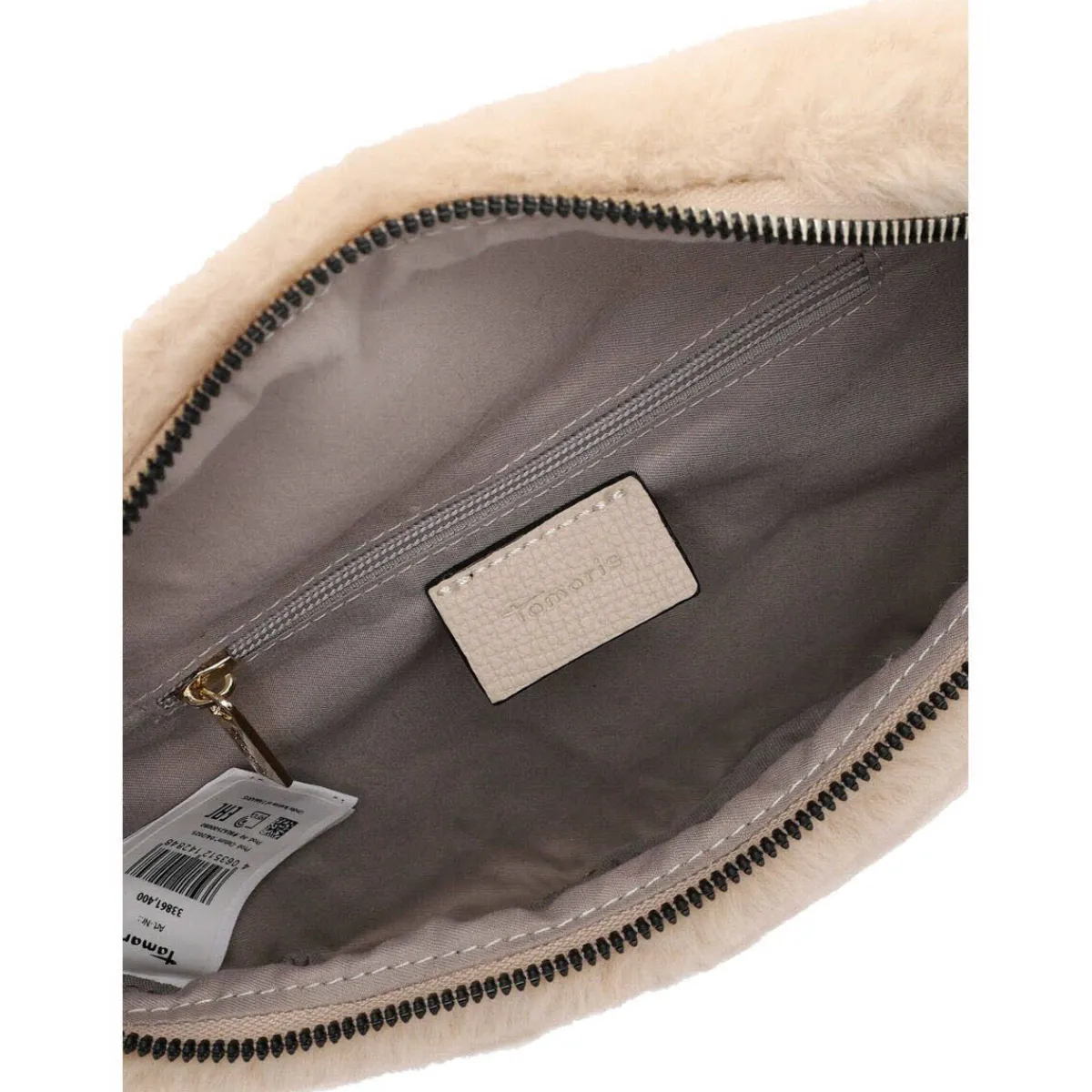 Kuschliges Obermaterial aus Plüsch in Beige macht die Umhängetasche besonders trendig und somit zum idealen Begleiter für die neue Saison.