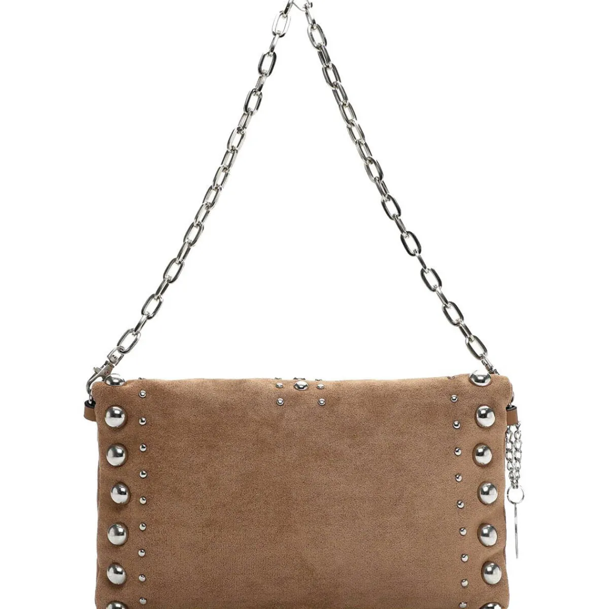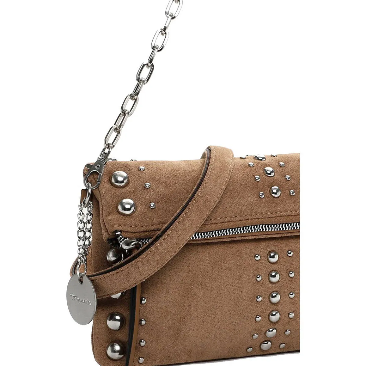 Die Handtasche aus softem Textil ist mit einer angenehmen Haptik versehen, die der Tasche das gewisse Etwas verleiht. Ein besonderer Hingucker sind die angebrachten Nieten in Silber.