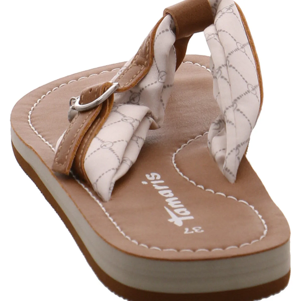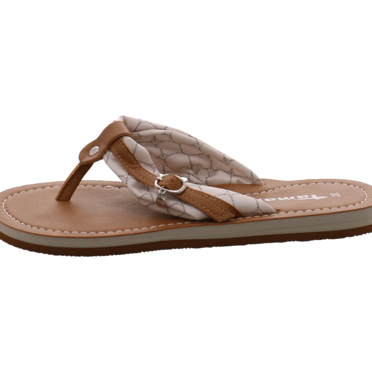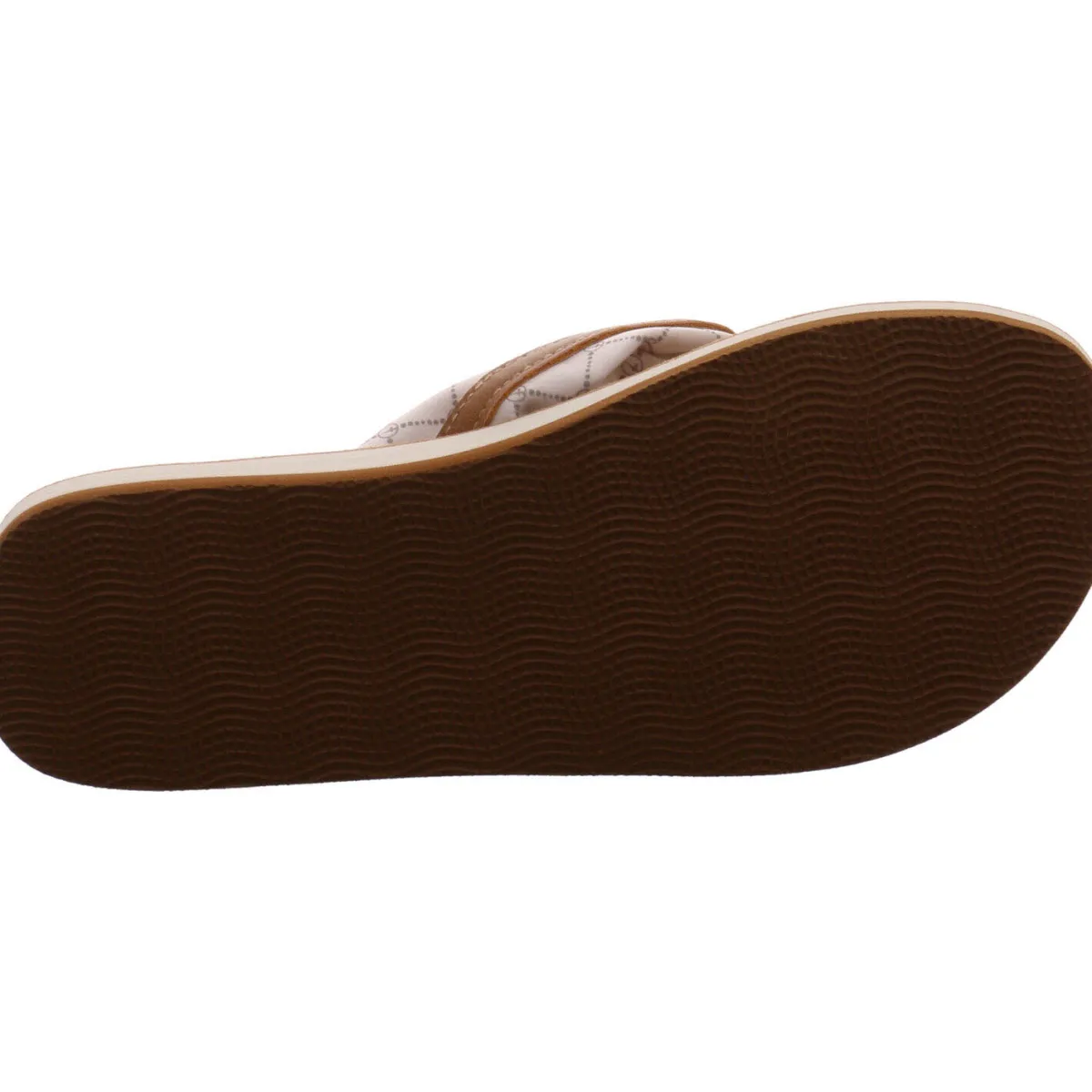 Das Obermaterial in Braun in einem originellen Mix aus einem schmalen Kunstlederbändchen und einem breiten Satinband in Cream Weiß mit grafischem Muster macht diese Zehentrenner einzigartig und zugleich absolut bequem.
