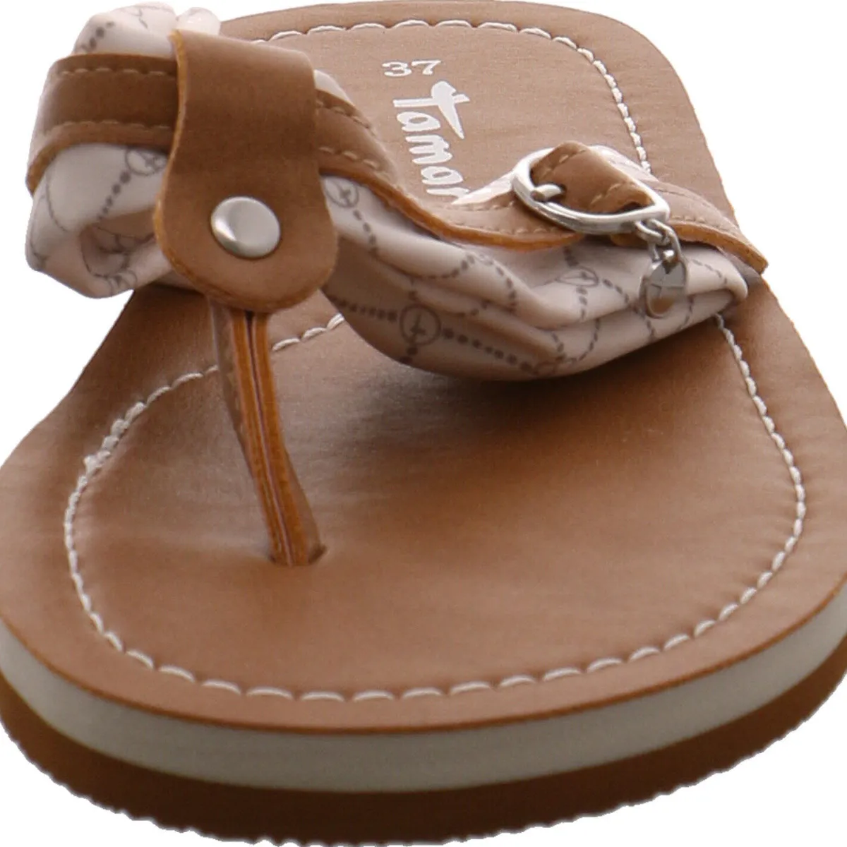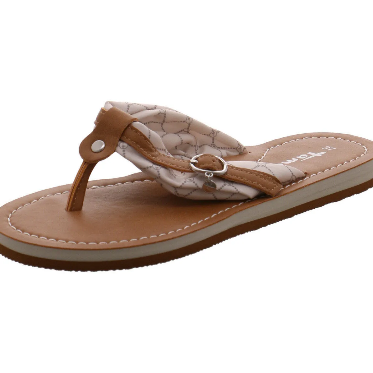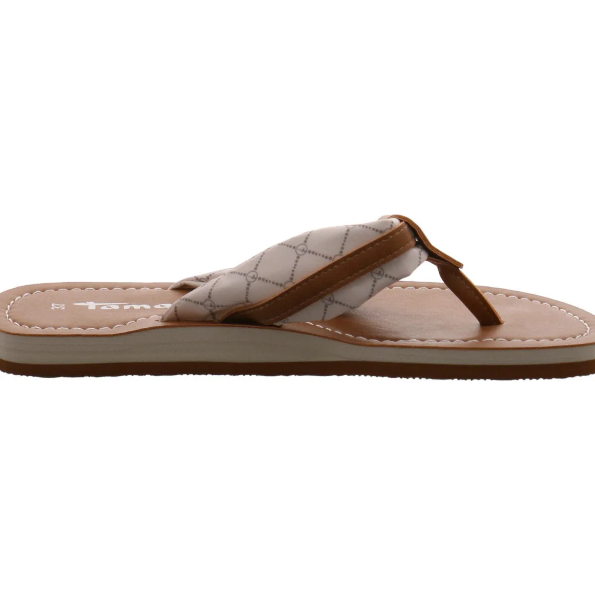Das Obermaterial in Braun in einem originellen Mix aus einem schmalen Kunstlederbändchen und einem breiten Satinband in Cream Weiß mit grafischem Muster macht diese Zehentrenner einzigartig und zugleich absolut bequem.