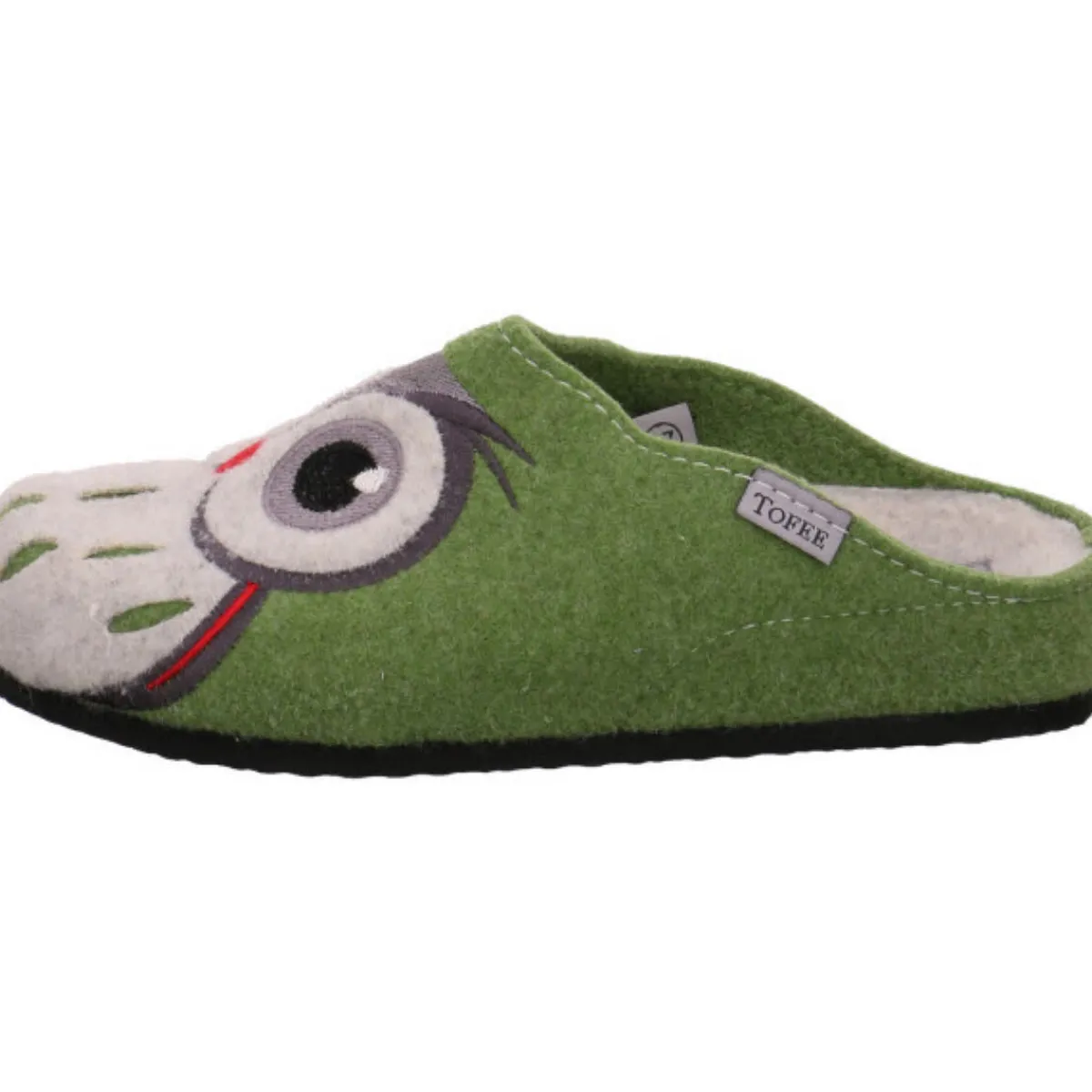 Als Eyecatcher auf dem robusten und langlebigen Obermaterial aus Filz in grün dient die gestickte Eule, die dem Schuh das gewisse Etwas verleiht.