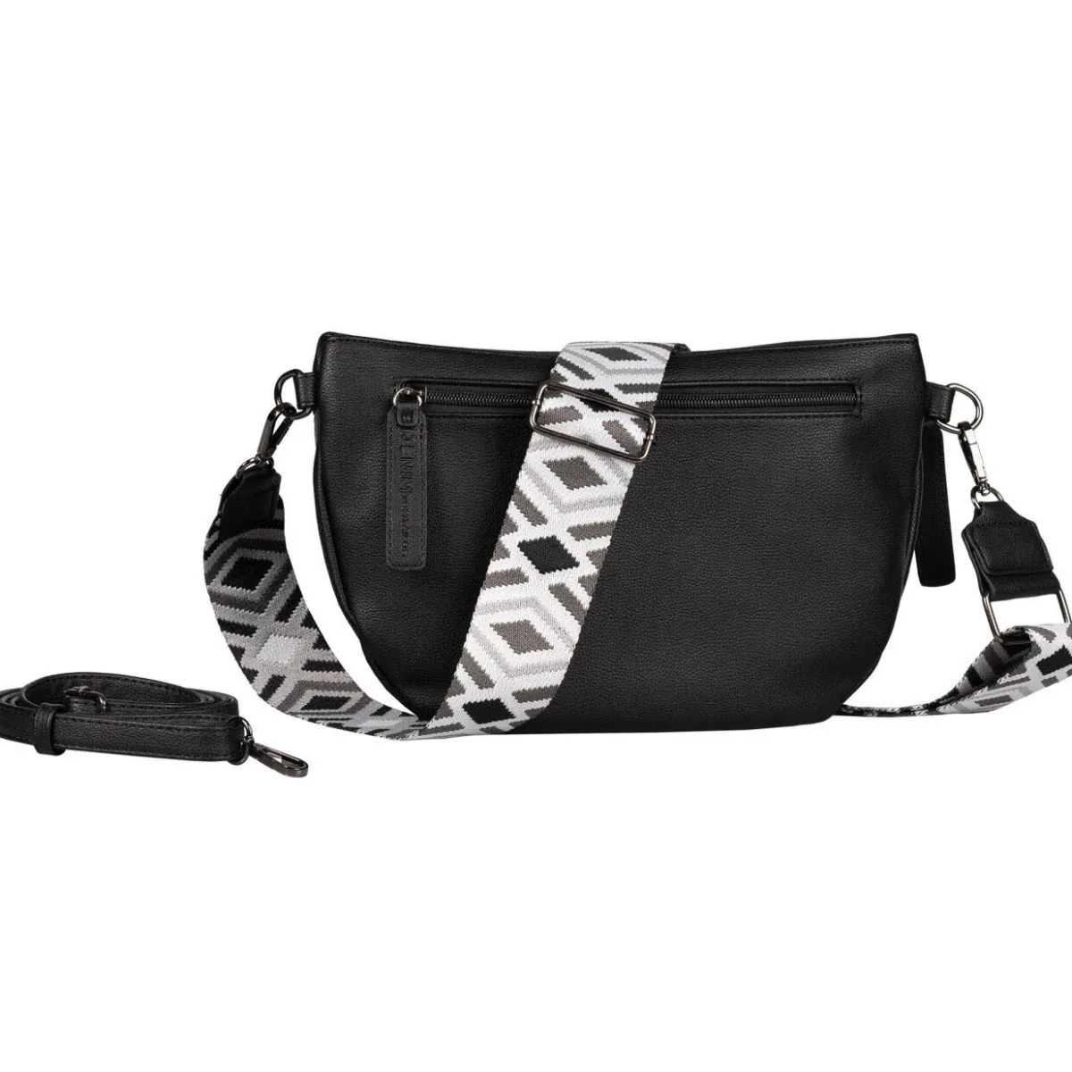 Gefertigt aus authentisch genarbtem Kunstleder in Schwarz macht sie zu jedem Outfit eine ausgesprochen gute Figur. Durch ihr praktisches Format kann die Tasche auch prima als Alltagsbegleiter verwendet werden. Absolutes Highlight und besonders modern ist der Umhängegurt mit dem grafischem Muster in Schwarz Weiß.