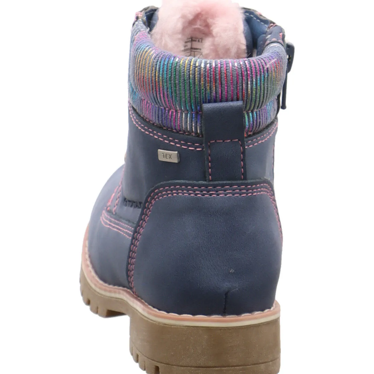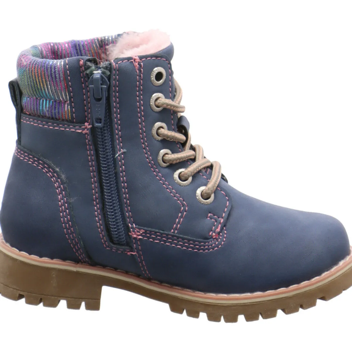 Gefertigt aus Kunstleder in Blau und mit farblich abgesetzten textilen Schaftabschluss in bunten Glitzer Streifen passt dieser Schuh perfekt zu jedem Herbstoutfit. Die Ziernähte in Rosa runden das Design des Schuhs gekonnt ab.