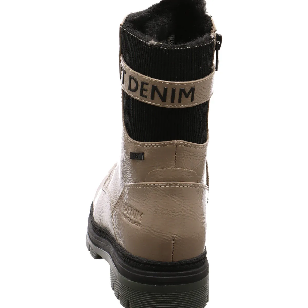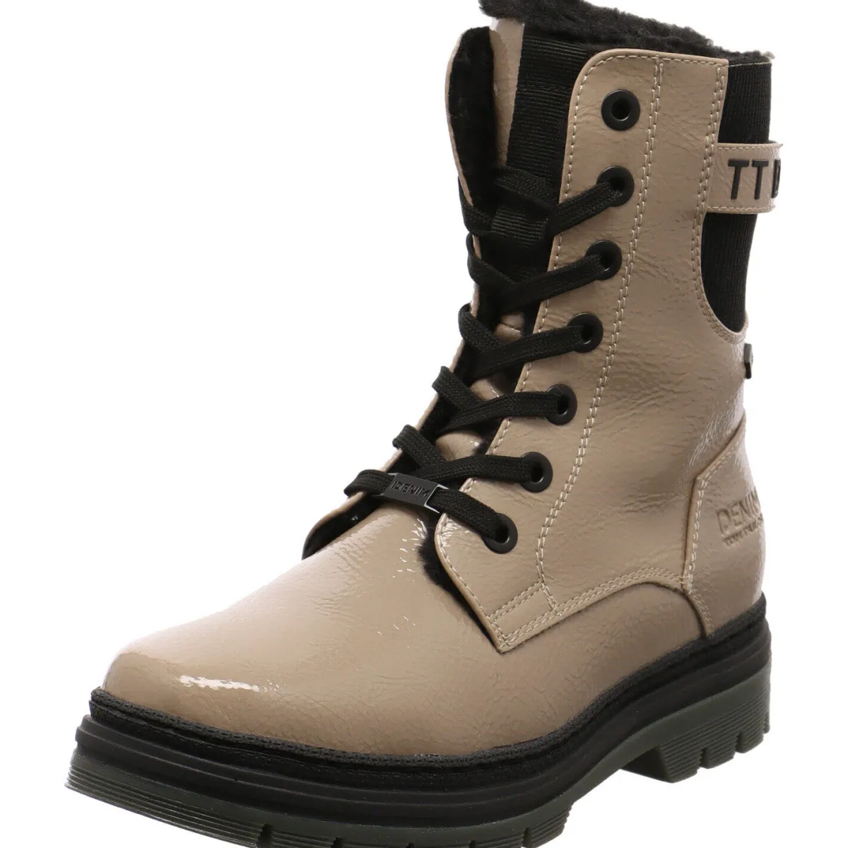 Das Obermaterial aus Kunstleder, begeistert durch seine Lack Optik in Beige und dem Strick Einsatz im Schaft in Schwarz.