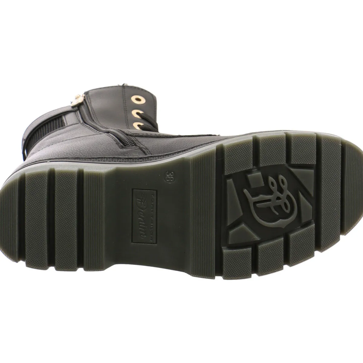 Das Obermaterial aus Kunstleder in Schwarz, ist an der Rückseite vom Schaft mit einem Textil Einsatz versehen. Darüber ist ein Riemen angebracht, auf dem das Markenlogo zu sehen ist. Durch den seitlichen Reißverschluss ist der Einstieg ganz einfach und mit der Schnürung, kann er optimal an den Fuß angepasst werden. Die Schnürsenkelösen sind Gold abgesetzt und ein direkter Eyecatcher. Das Innenfutter ist besonders flauschig und in Verbindung mit der Tex Ausstattung, die den Boots wasserabweisend macht, bleiben deine Fuße warm und trocken.