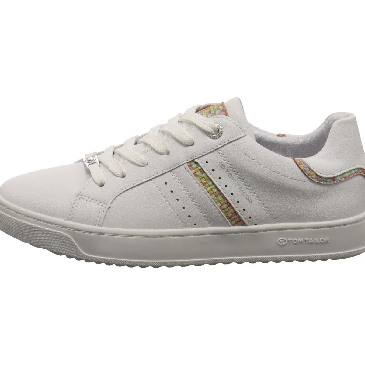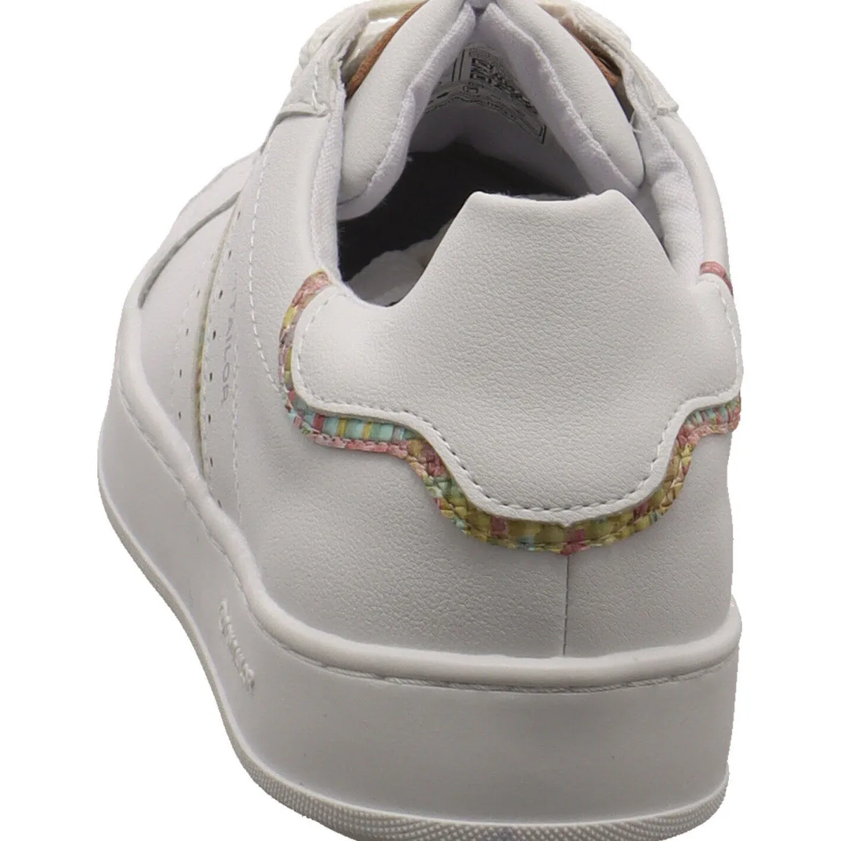 Das Obermaterial aus Kunstleder in Weiß, ist mit kleinen Details in Bast Optik in Bunt auf der Zunge, der Rückseite vom Schaft und an der Seite versehen. Kleine Lasercuts an den Seiten runden den modernen Look perfekt ab.
