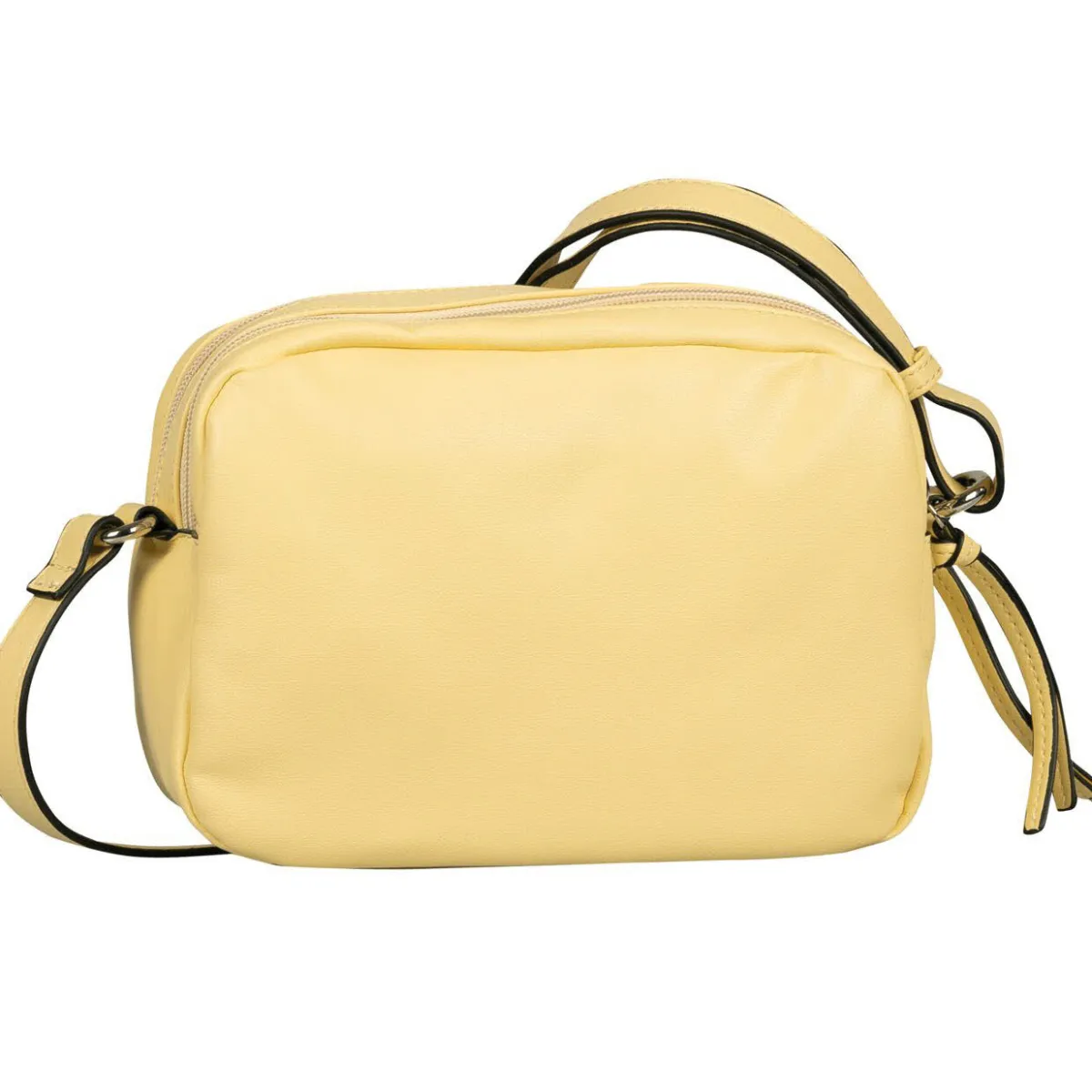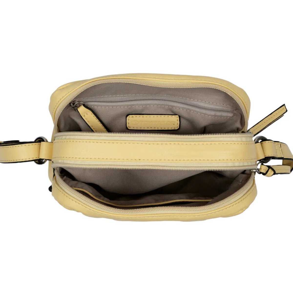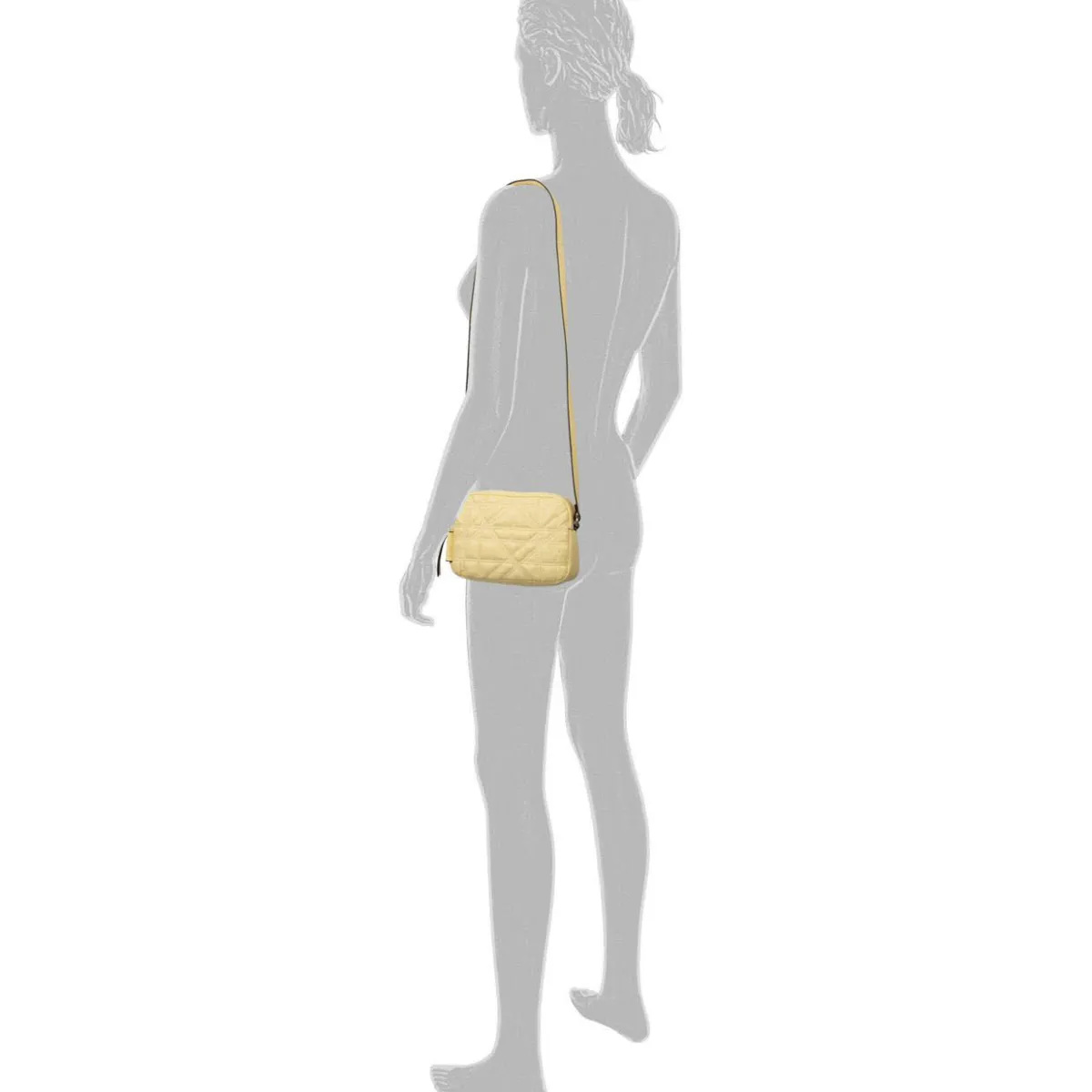 Das authentisch genarbte Kunstleder in Gelb ist auf der Rückseite mit geometrisch gesteppter Wattierung versehen. Zwei Hauptfächer werden mit Reißverschluss geschlossen und bieten Platz für alles, worauf du im Alltag nicht verzichten möchtest. Durch den praktischen, verstellbaren Umhängegurt kann die Tasche auch crossover getragen werden.