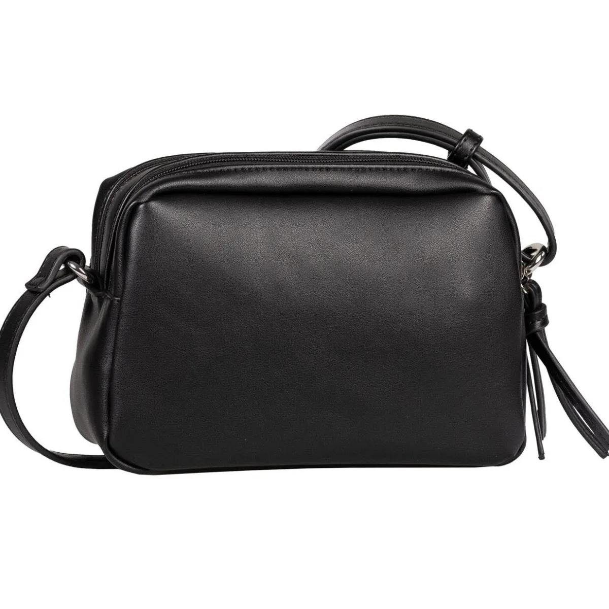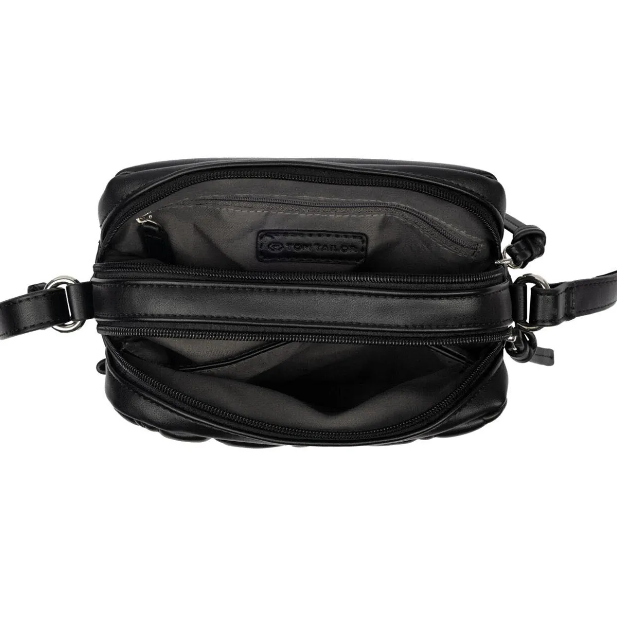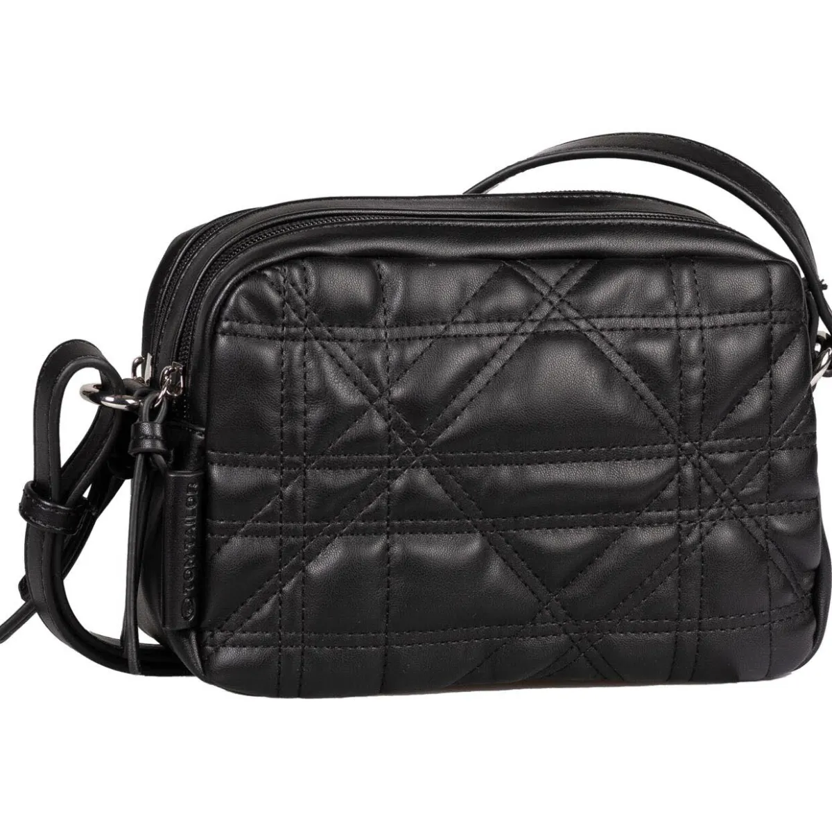 Das authentisch genarbte Kunstleder in Schwarz ist auf der Rückseite mit geometrisch gesteppter Wattierung versehen. Zwei Hauptfächer werden mit Reißverschluss geschlossen und bieten Platz für alles, worauf du im Alltag nicht verzichten möchtest. Durch den praktischen, verstellbaren Umhängegurt kann die Tasche auch crossover getragen werden.