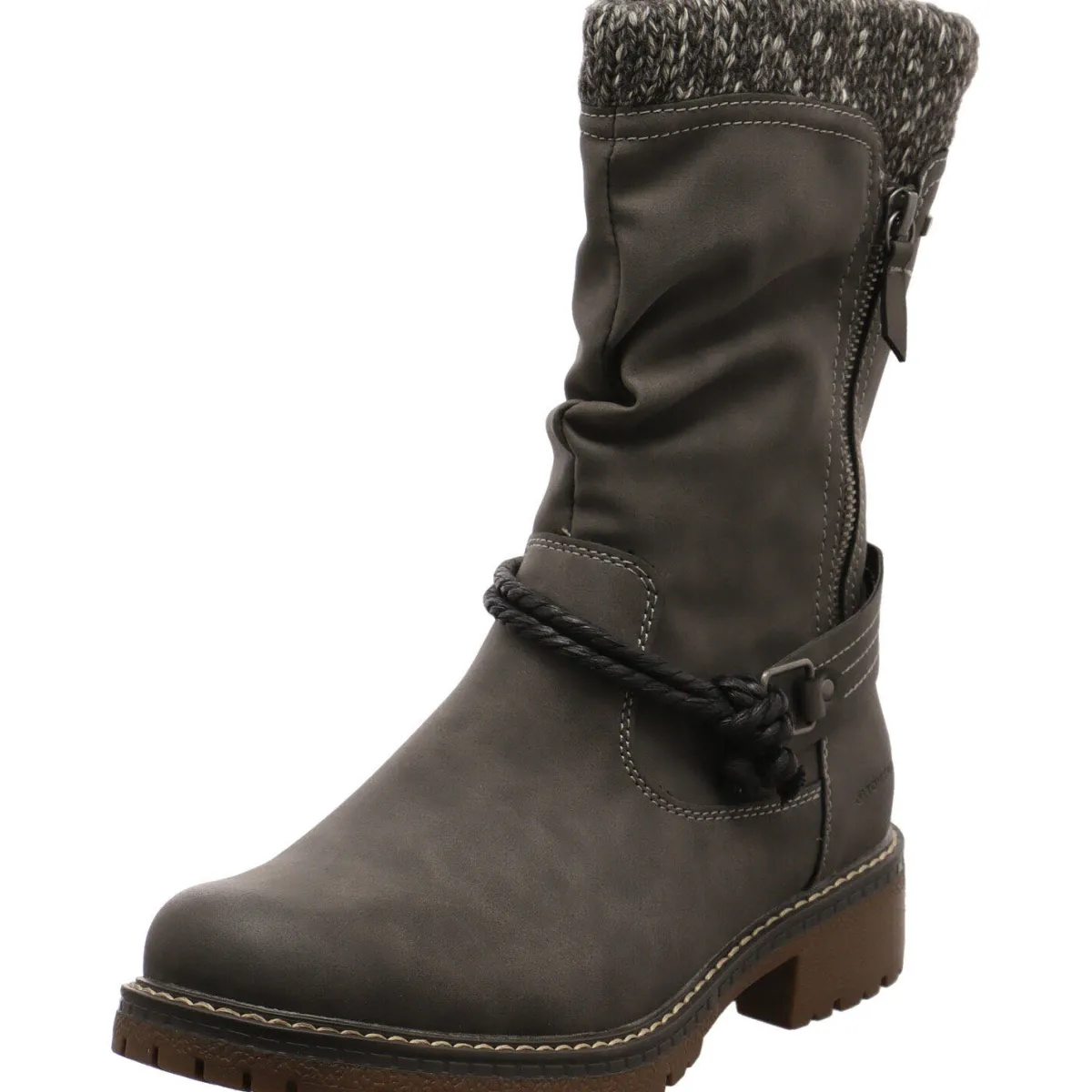 Das Obermaterial aus Kunstleder in Grau wurde mit im Antik Look gefertigt und ist so im angesagten Design. Der Schaftrand besteht aus Strick und sieht dadurch nicht nur besonders stylisch aus, sondern spendet auch extra Wärme. Highlights sind der seitliche Zierreißverschluss und die Zierschnürung über dem Fersenbereich.