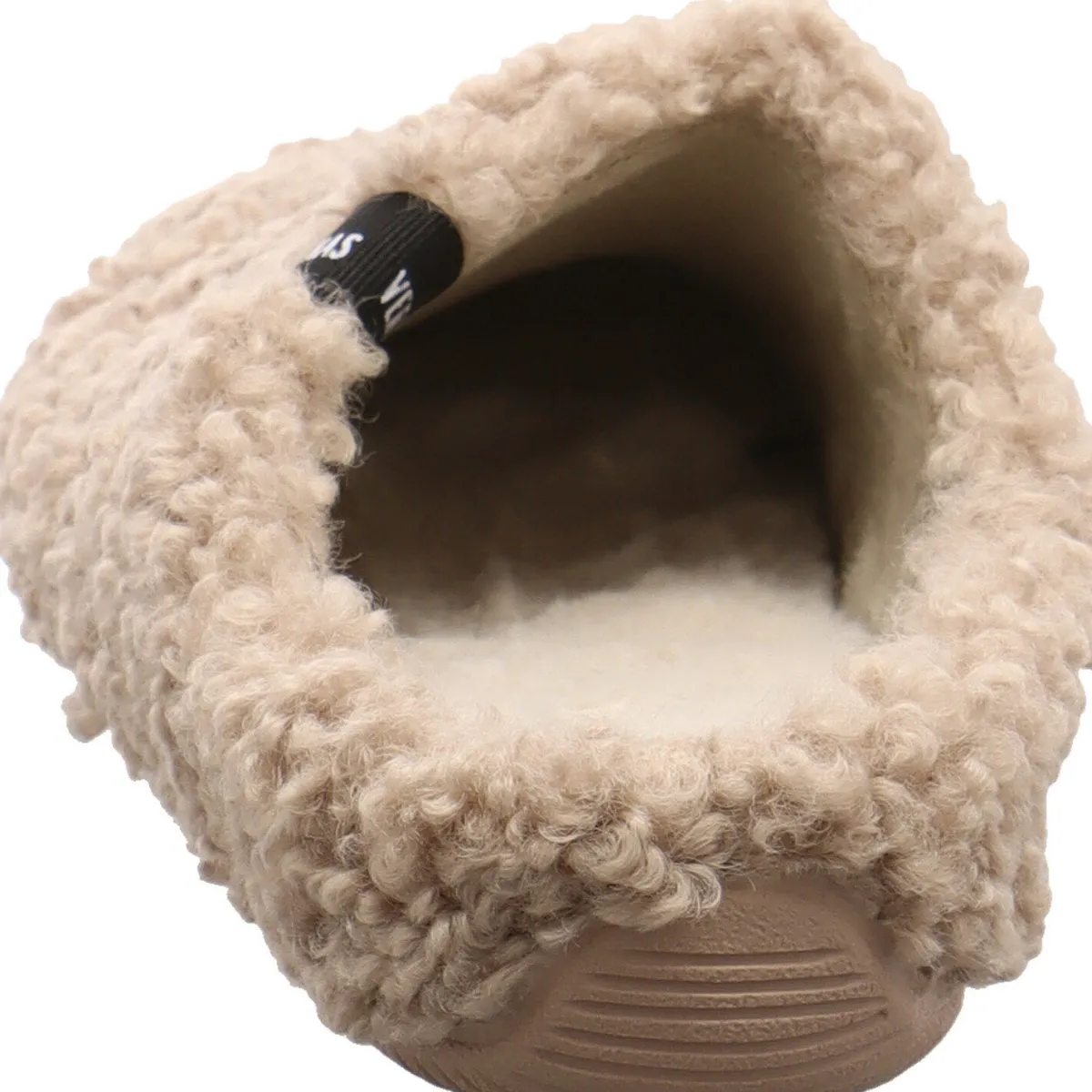 Das kuschelig weiche Textil Obermaterial in hellem Braun hält die Füße auch im Winter garantiert warm und die Gummisohle bietet gleichzeitig einen sicheren Halt. Die flauschig weiche Innensohle sorgt für besonderen Tragekomfort.