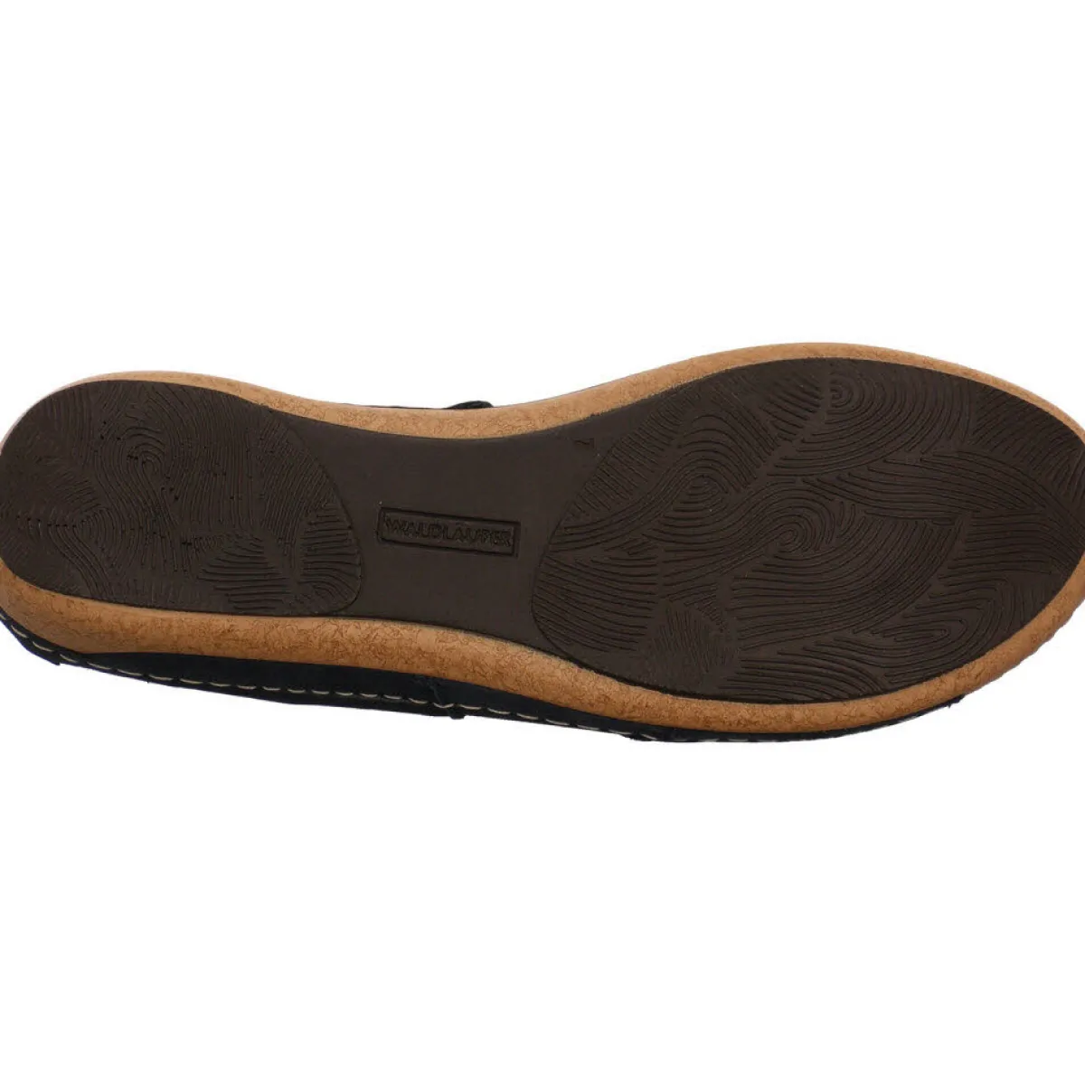 Dezente Highlights wie helle Ziernähte um die Sohle ein Metall-Element auf dem Blatt und die Schnalle in Silber geben dem Schuh einen modernen Look.