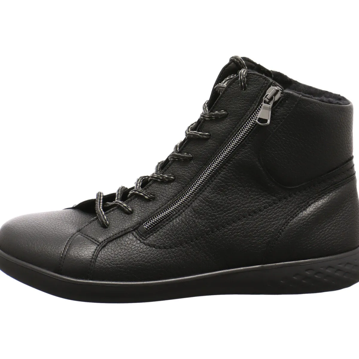 Das Obermaterial wurde aus weichem Echtleder in Schwarz gefertigt. Durch den doppelten Reißverschluss ist der Einstieg besonders einfach. Mit der Schnürung, kann der Schuh optimal an den Fuß angepasst werden.