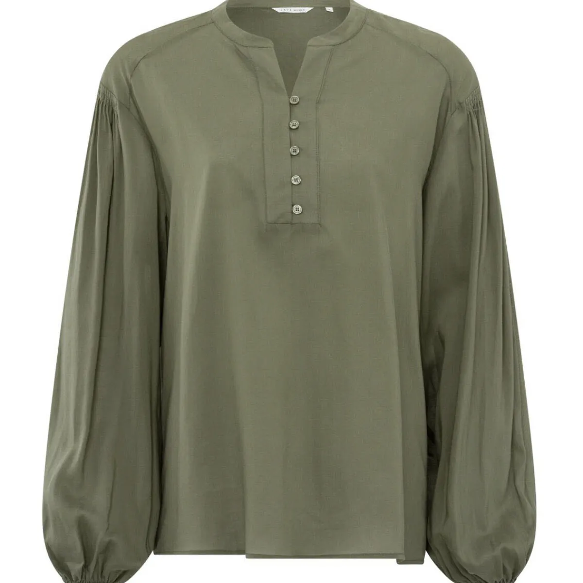 Das fließende Gewebe in Olive Grün, begeistert mit tollen Details. Wie dem V-Ausschnitt mit Knöpfen, den weiten langen Ärmeln und den Plisseedetails an Ärmeln und Rücken.