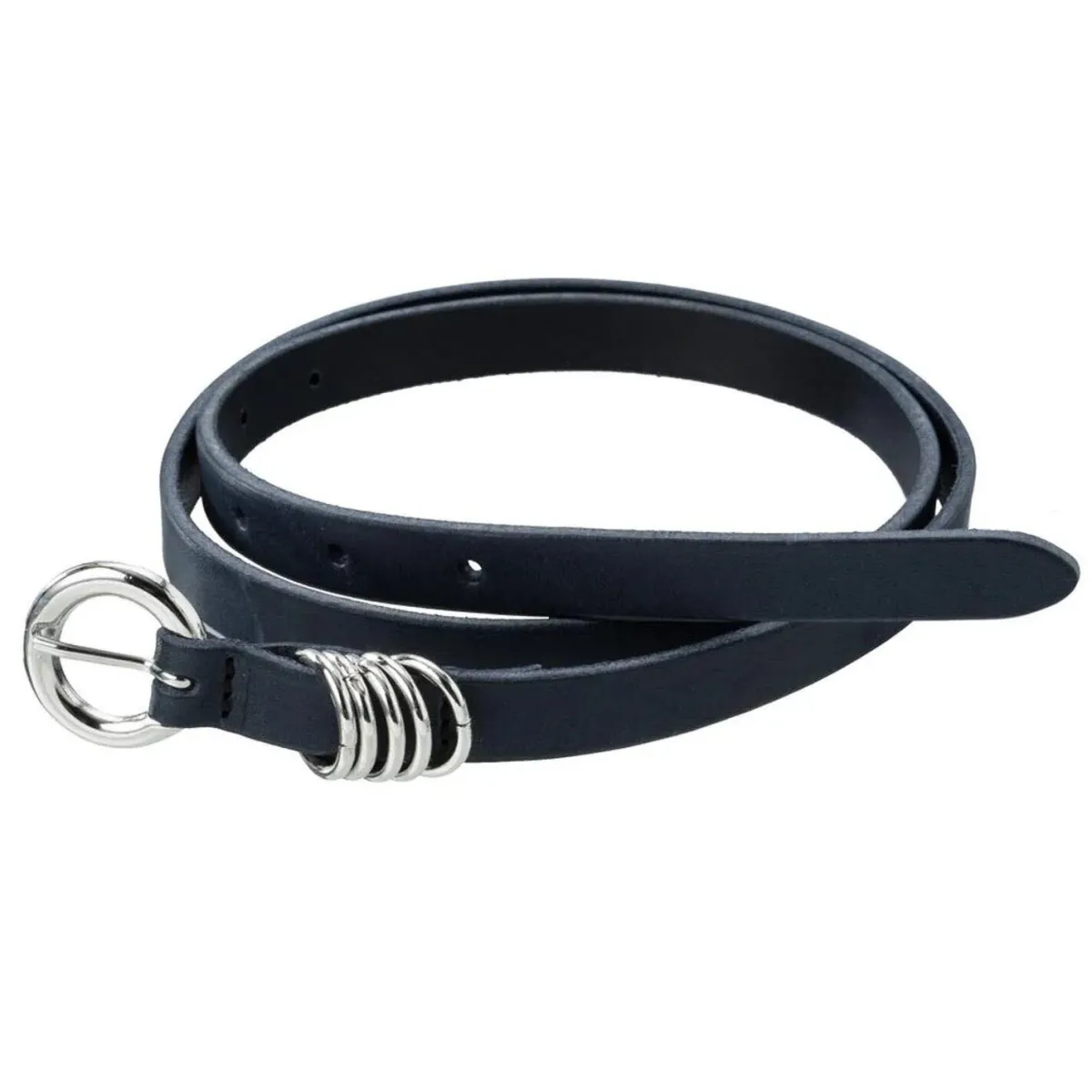 Er wurde aus Kunstleder in Blau gearbeitet und ist mit einer eleganten, runden Dornschnalle in Silber versehen. Mit dieser kannst du die Länge individuell anpassen. Kleine Ringe in Silber runden den modischen Look perfekt ab.