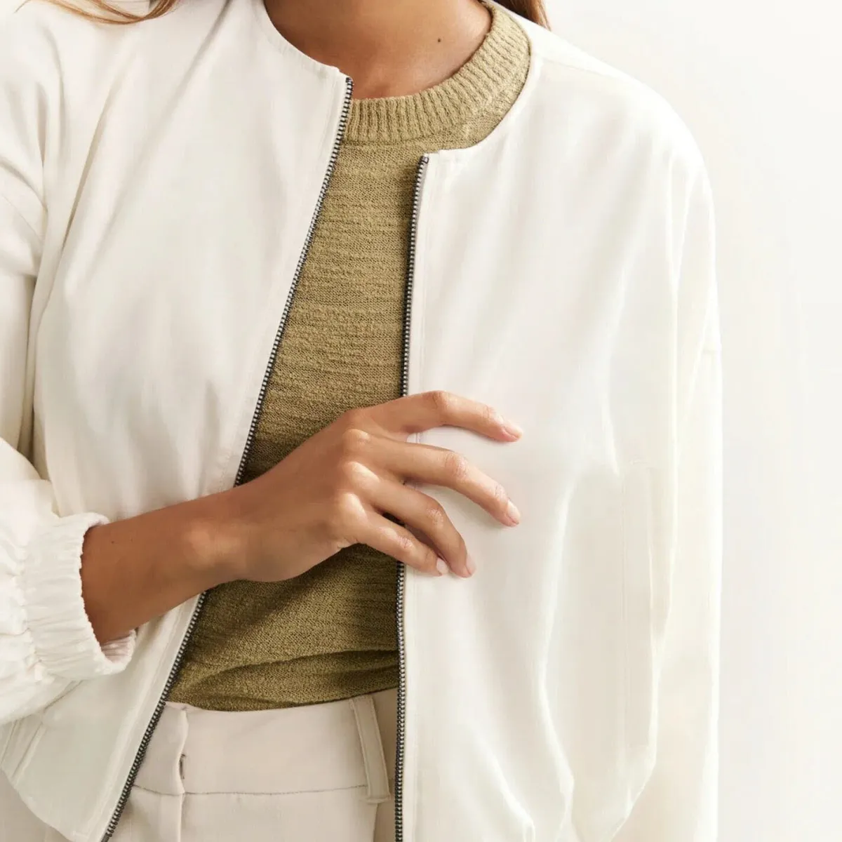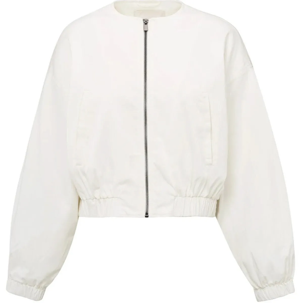 Sie wurde aus weichem, fließenden Material in Weiß gefertigt. Der Rundhalsausschnitt und die langen Ärmel mit elastischen Bündchen verleihen dir einen sportlich, lässigen Look. Typisch für die Art von Jacke ist der kurze Schnitt mit den Bündchen und dem Reißverschluss auf der Vorderseite. Du kannst sie ganz vielseitig kombinieren und jedem deiner Outfits das gewisse Etwas verleihen.