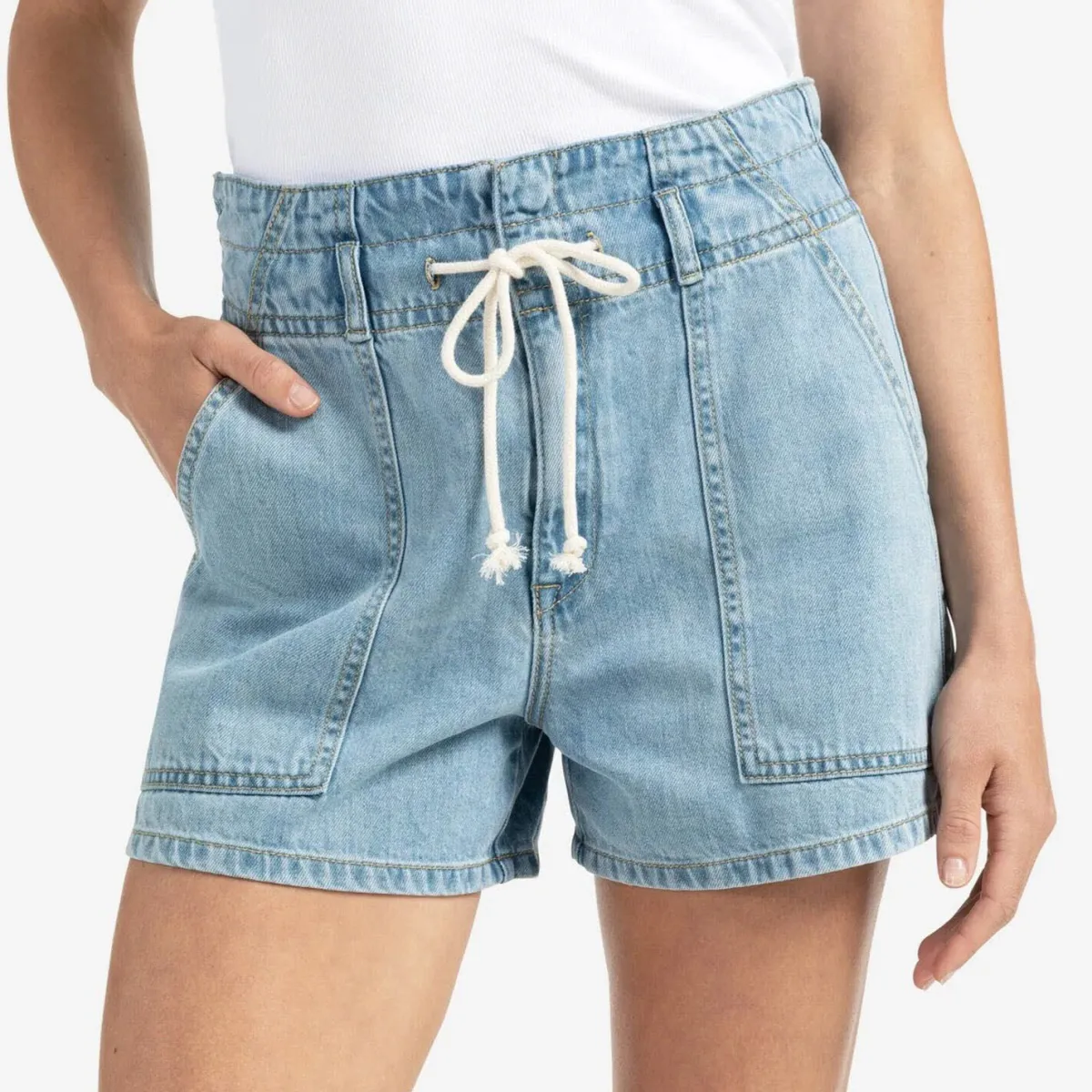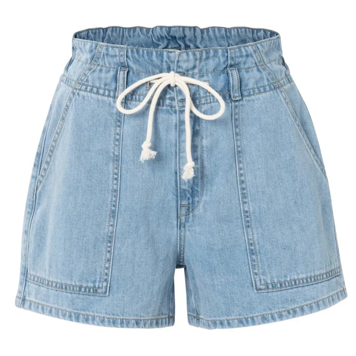 Der leichte Jeans Stoff in einem hellen Blau eignet sich perfekt für den Sommer. Sie hat einen hohen elastischen Bund mit Kordelzug und aufgesetzte Taschen auf der Vorderseite. Auf dem Gesäß sind Paspeltaschen angebracht.