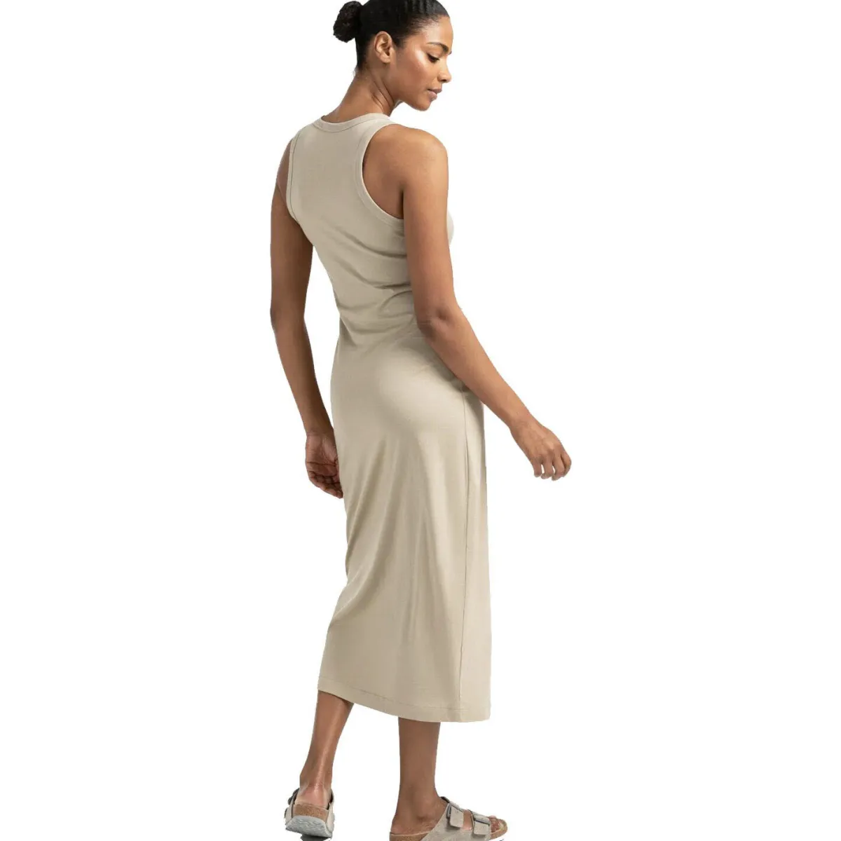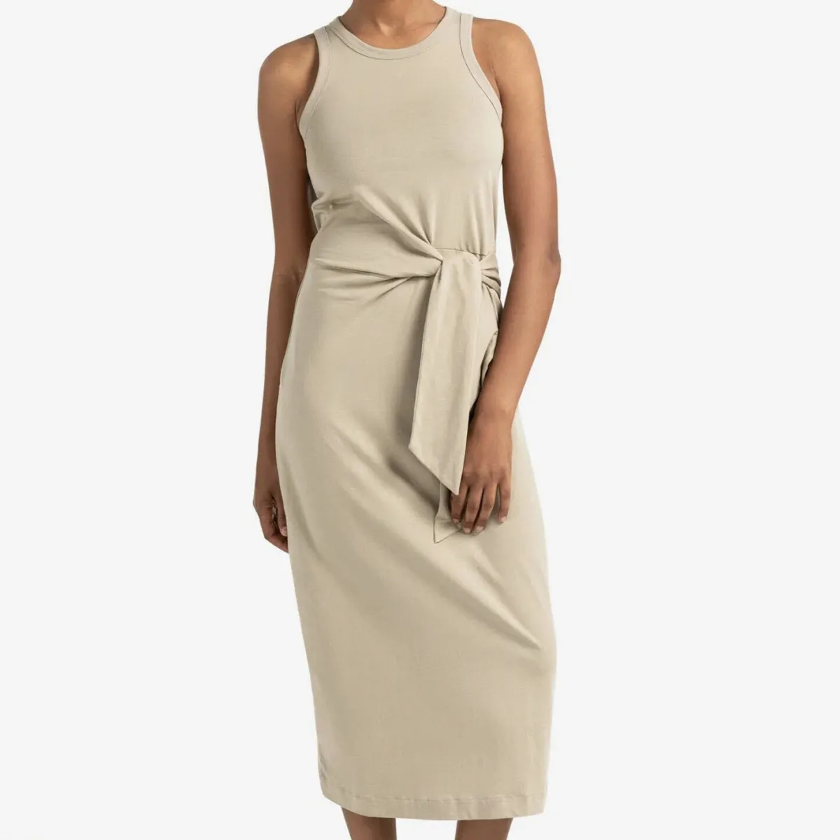 Es wurde aus reiner Baumwolle in Beige gefertigt. Es hat einen Rundhalsausschnitt und eine enge Passform. Auch hier findest du ein Knotendetail an der Taille. Es ist Ärmellos und hat die angesagte Midi Länge.