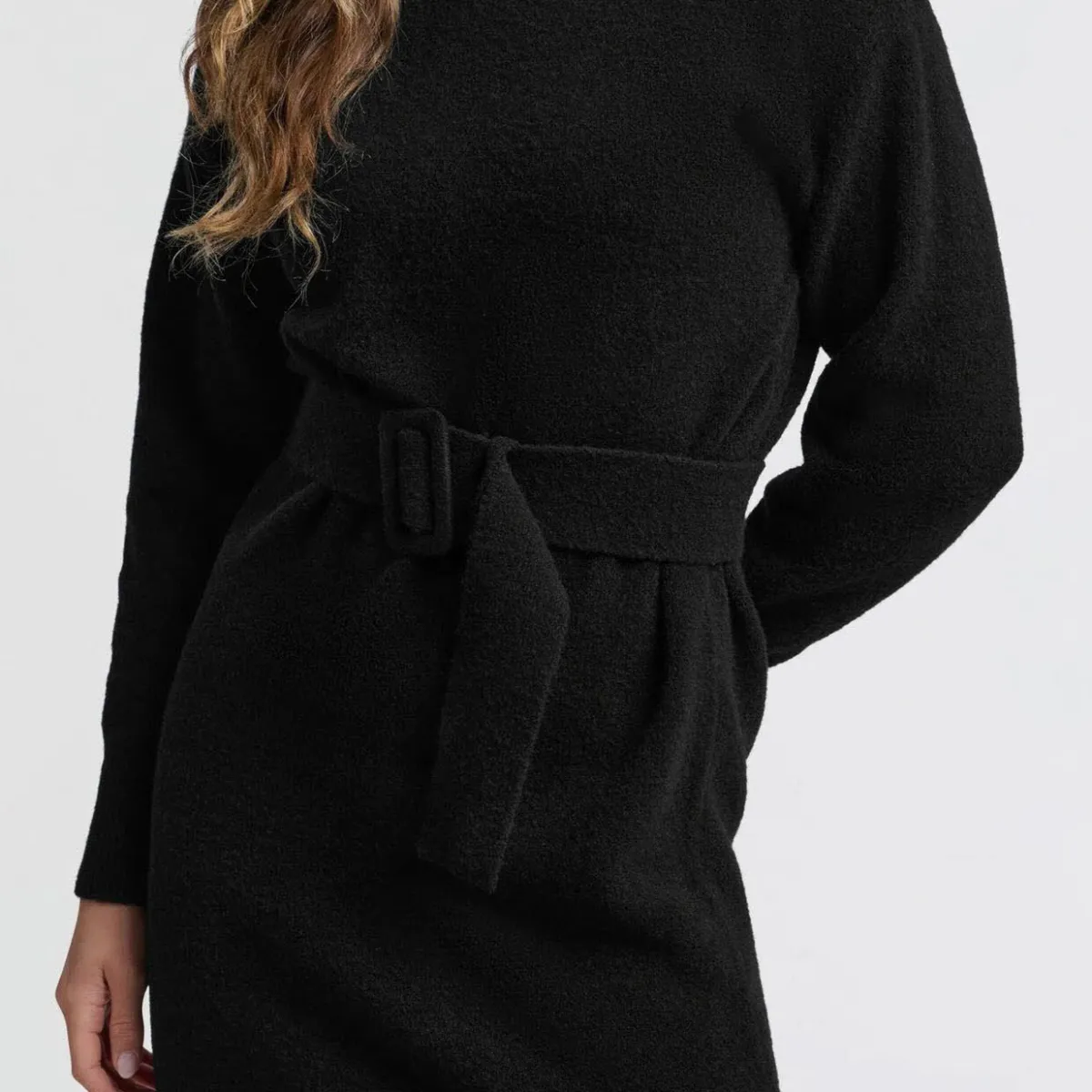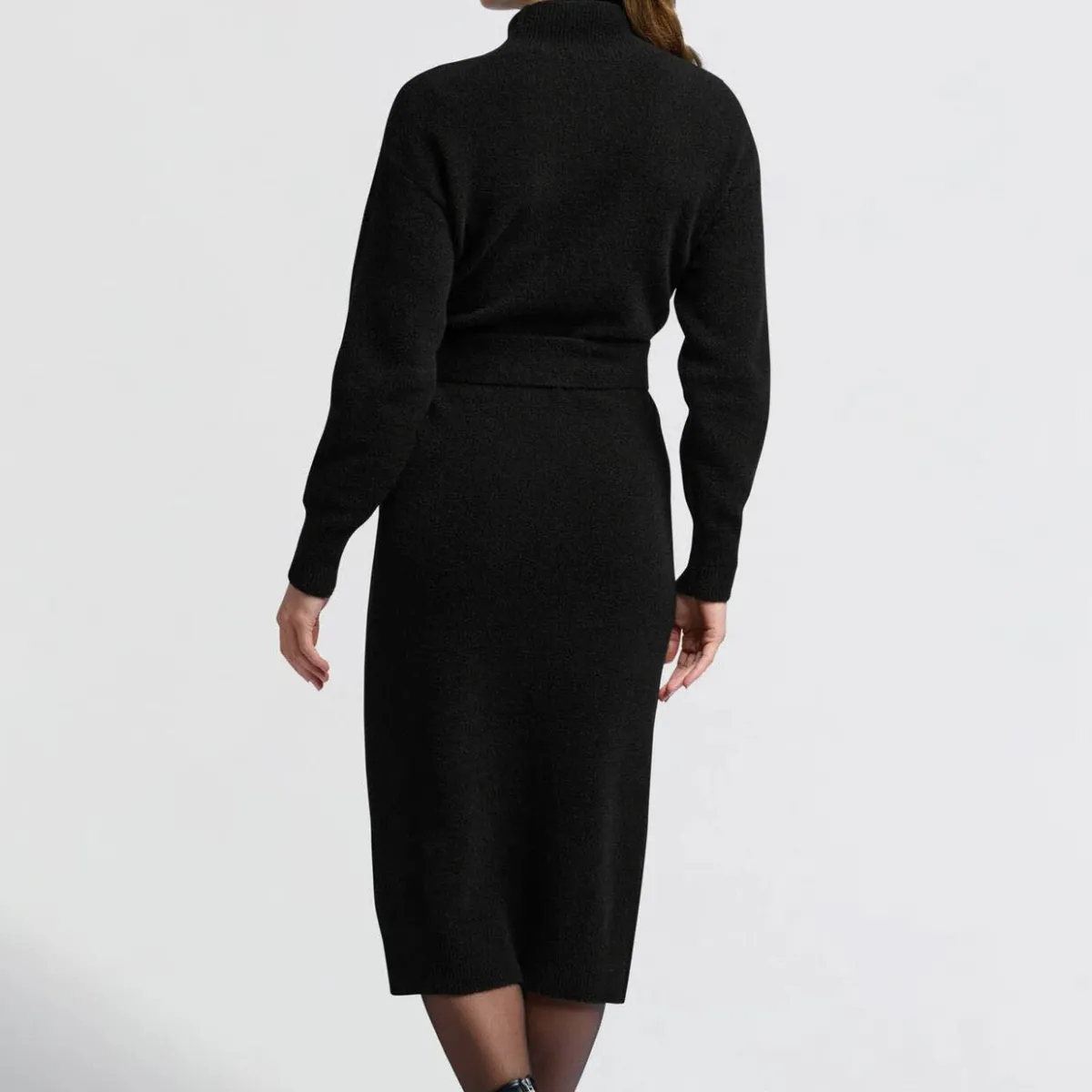 Das Strickgewebe in Schwarz ist mit einem bequemen Rollkragen und langen Ärmel ausgestattet. Das Kleid hat eine legere Passform und wird durch den farblich abgestimmten Taillengürtel toll in Szene gesetzt.