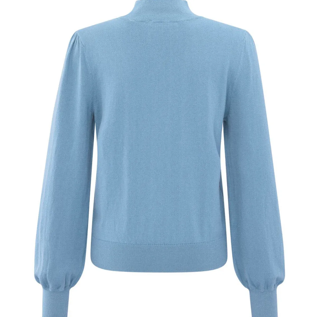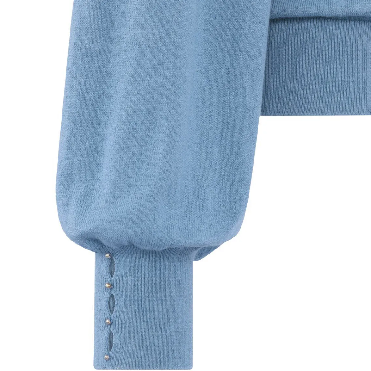 Das weiche Strickgewebe in Blau ist auf der Vorderseite mit kleinen Knöpfen und Cutouts verziert. Diese kommen durch den kleinen Stehkragen besonders gut zur Geltung. Er hat lange Ballonärmel mit Rippstrick Bündchen an denen die Knöpfe ebenfalls zu finden sind. Er hat einen normalen Schnitt, und verleiht jedem Outfit das gewisse Etwas.