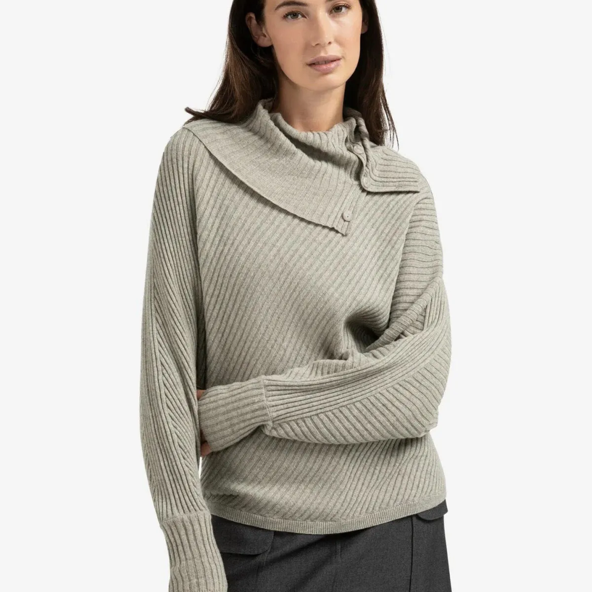 Er wurde aus weichem Rippstrick in Grau gefertigt und hat lange Fledermausärmel, welche ihm einen individuellen Look verleihen. Der hohe Kragen ist an der Seite mit einer Knopfleiste gearbeitet so kannst du ihn nach deinen Wünschen knöpfen. Die diagonale Rippung unterstreicht den modernen Look.