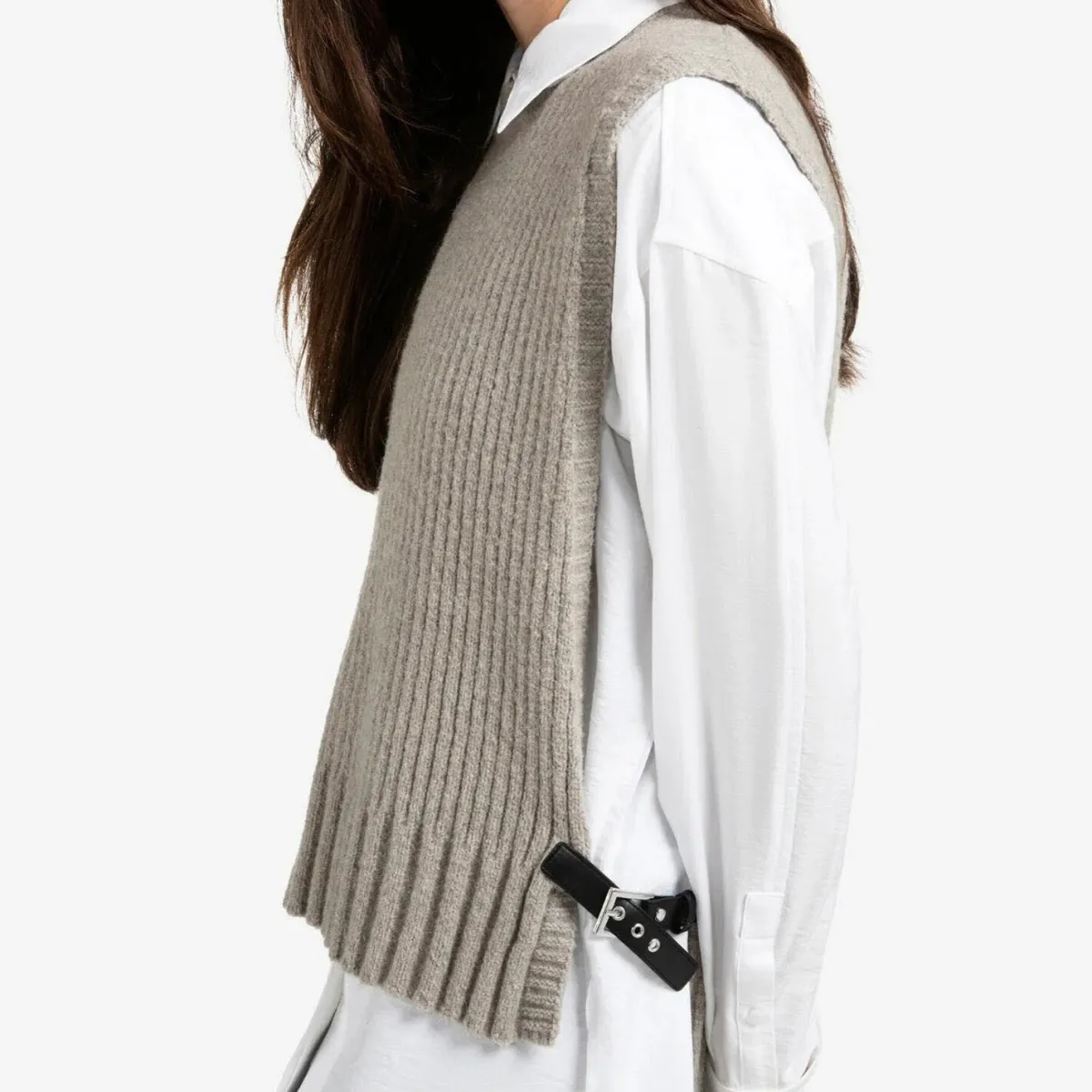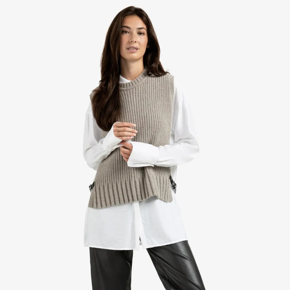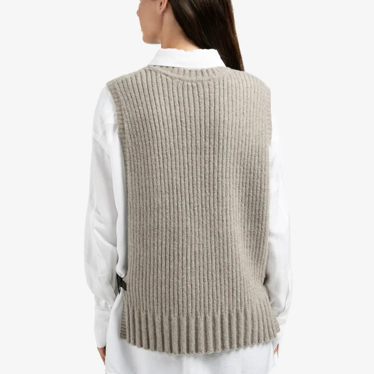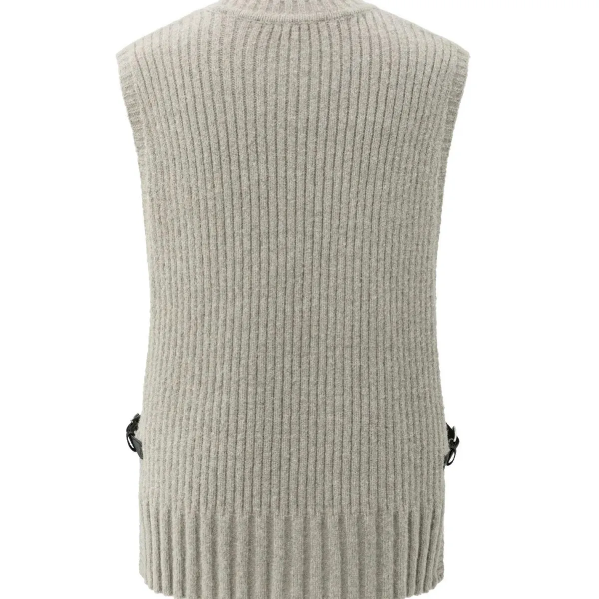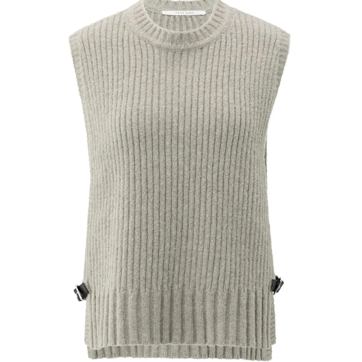 Er wurde aus dickem Strick in Grau mit Rippstrick gearbeitet. Er hat einen normalen Rundhalsausschnitt und ist an den seiten mit Lederschnallen gearbeitet. Diese machen ihn zu einem echten Hingucker. Er hat eine normale Passform und ist etwas länger geschnitten. Du kannst ihn super mit einer Bluse oder einem Shirt kombinieren.