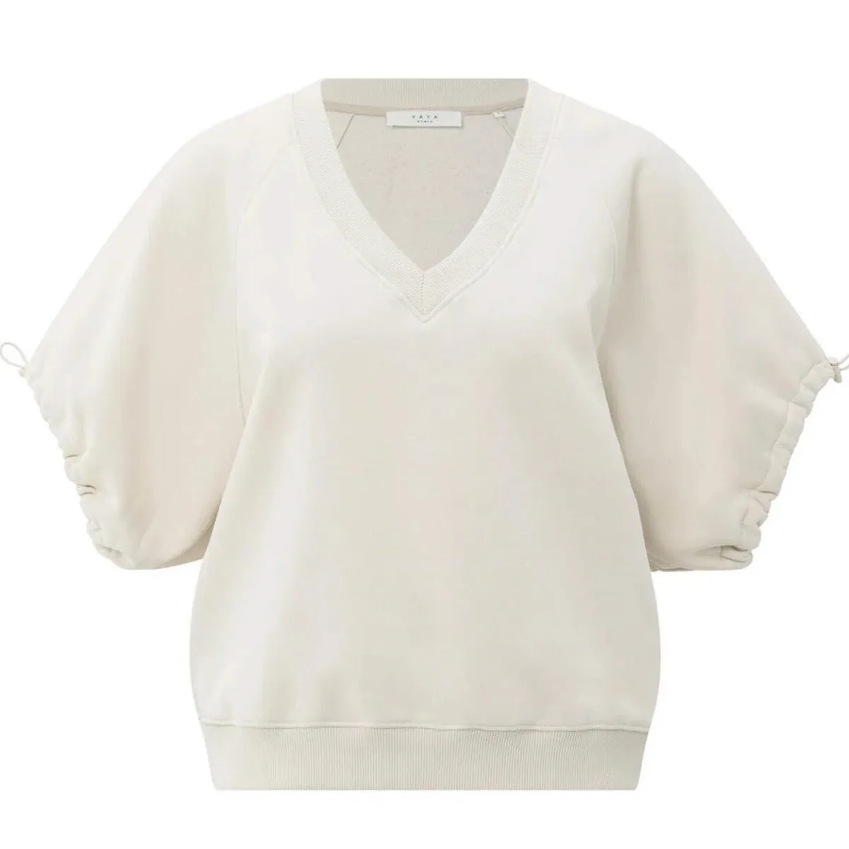 Das Mischgewebe in Beige ist mit einer Oversize Passform gearbeitet. Es hat einen V-Ausschnitt und als Eyecatcher kurze, weite Ärmel, welche mit einem Kordelzug gearbeitet sind. So kannst du ihre Form und Länge nach deinen Vorstellungen einstellen.