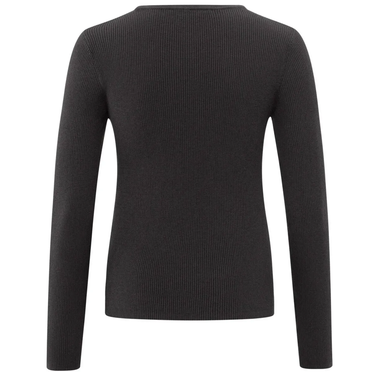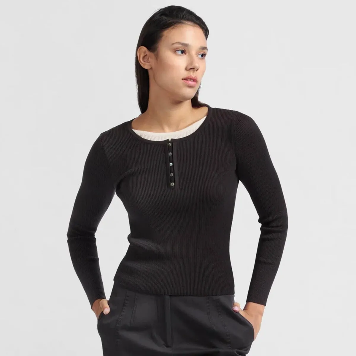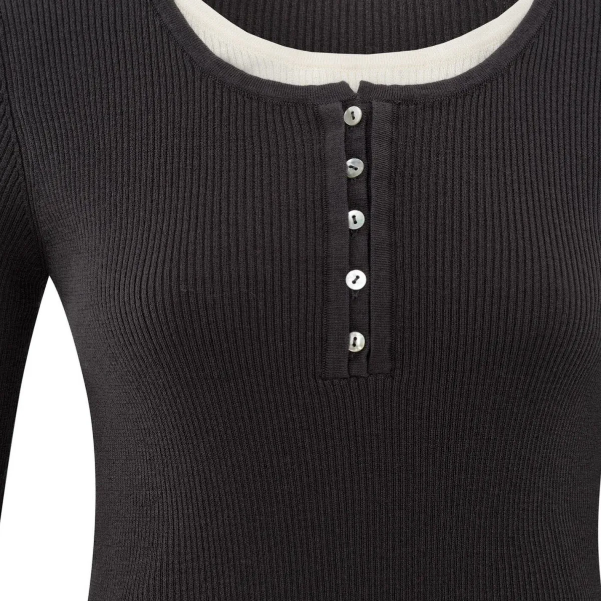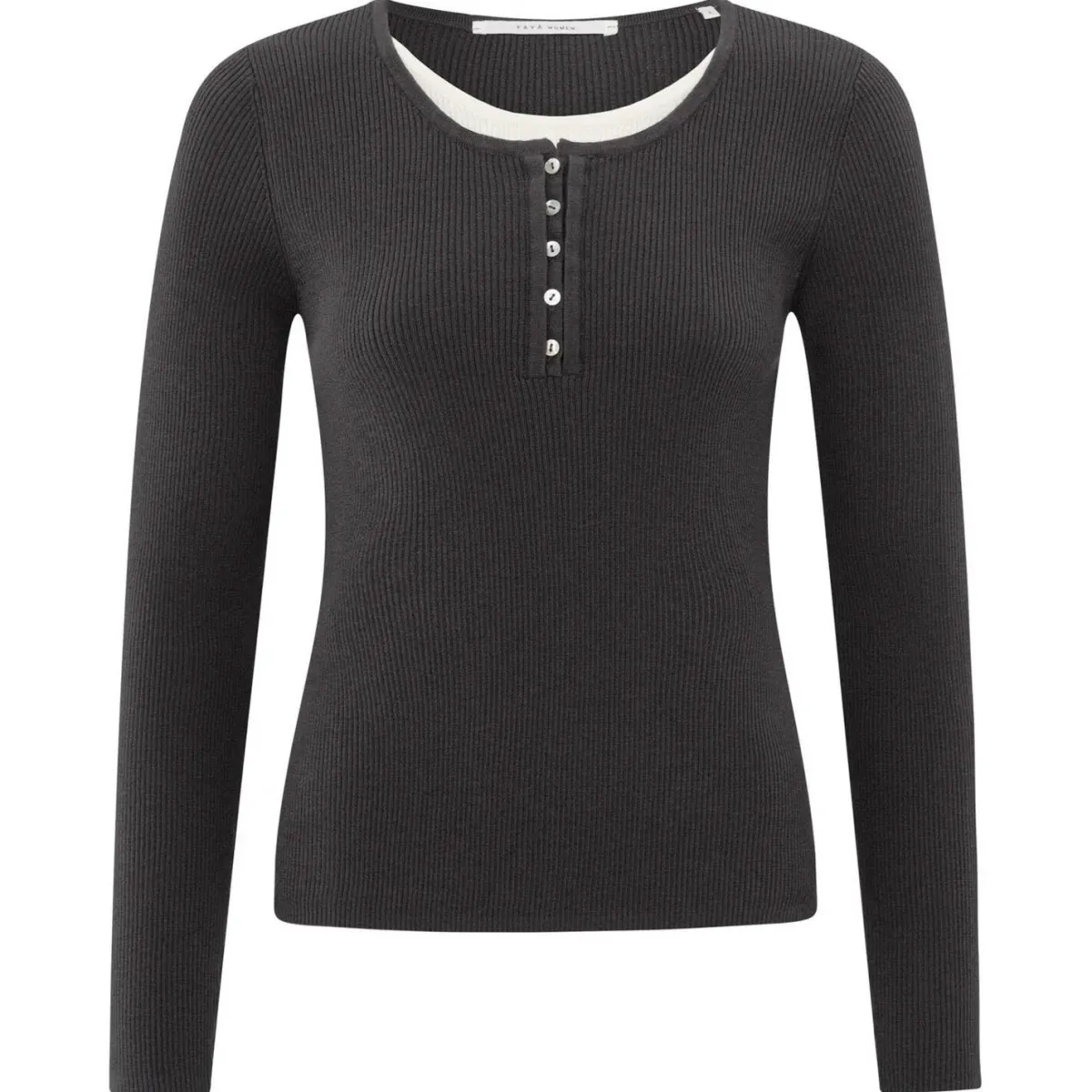 Das gerippte Shirt in Schwarz hat eine schmale Passform, lange Ärmel und einen Rundhalsausschnitt mit Knopfleiste. Darunter wird ein Shirt in Weiß angedeutet und erscheint optisch im Lagenlook. Ob Casual zur Jeans oder schick kombiniert, ein toller Allrounder für jeden Anlass.