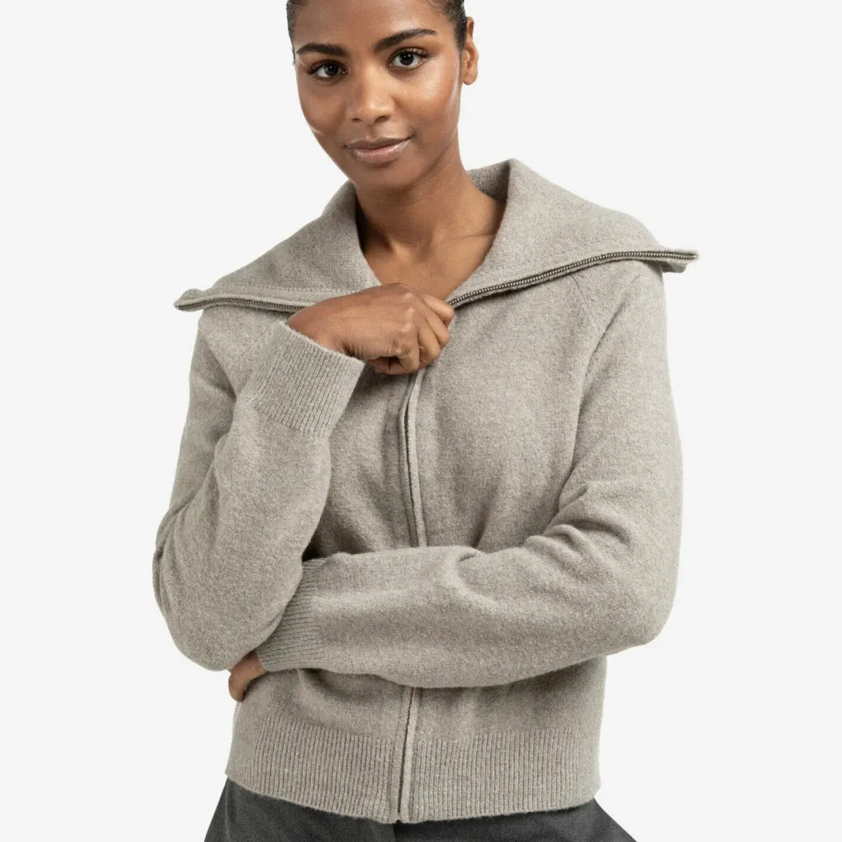 Der weiche Strickstoff in Grau ist mit einem großen, breiten Kragen gearbeitet. Dieser kann komplett durch den Reißverschluss der Strickjacke mit geschlossen werden. Der Cardigan hat lange Ärmel mit Rippstrickbündchen und kann perfekt im Lagenlook oder einzeln kombiniert werden.