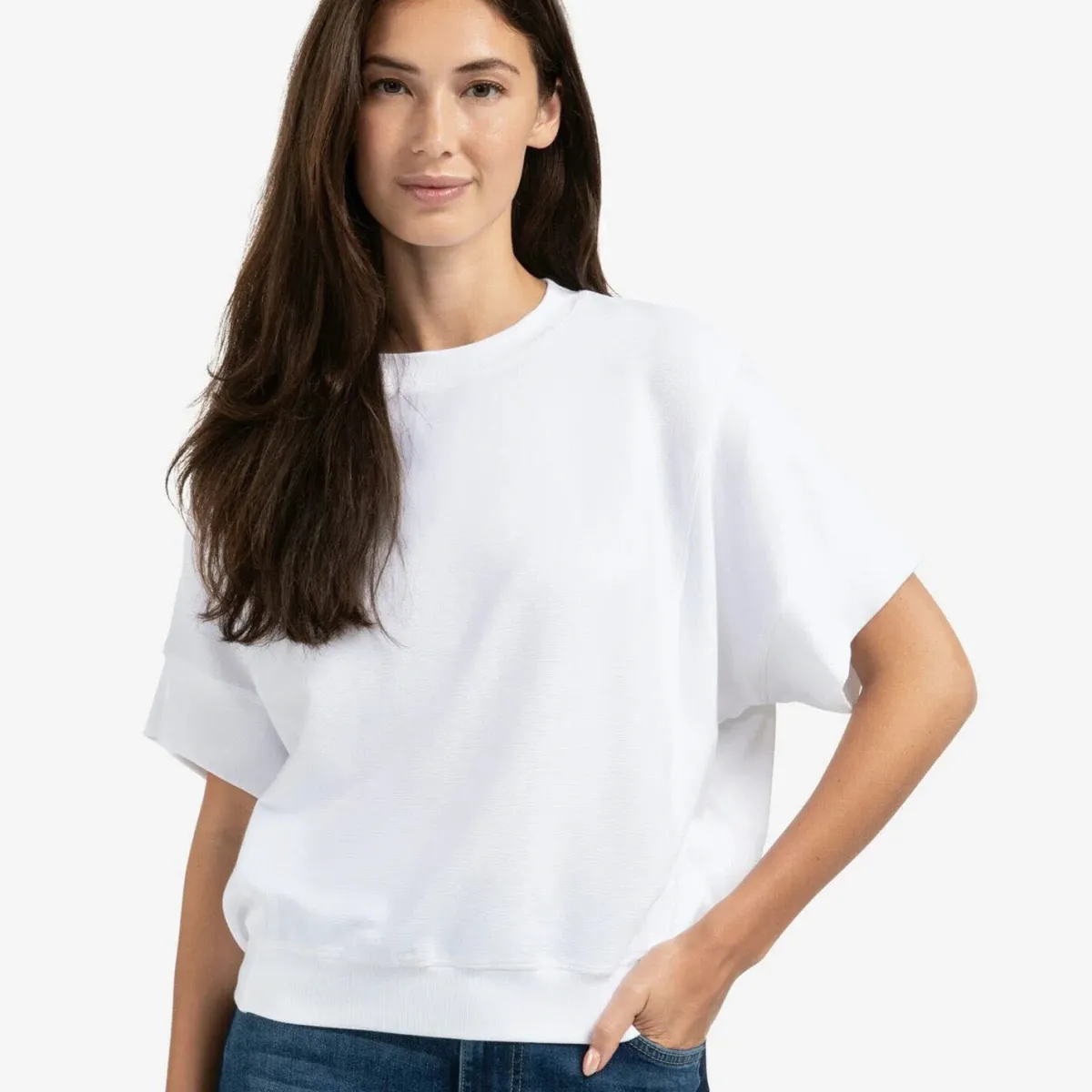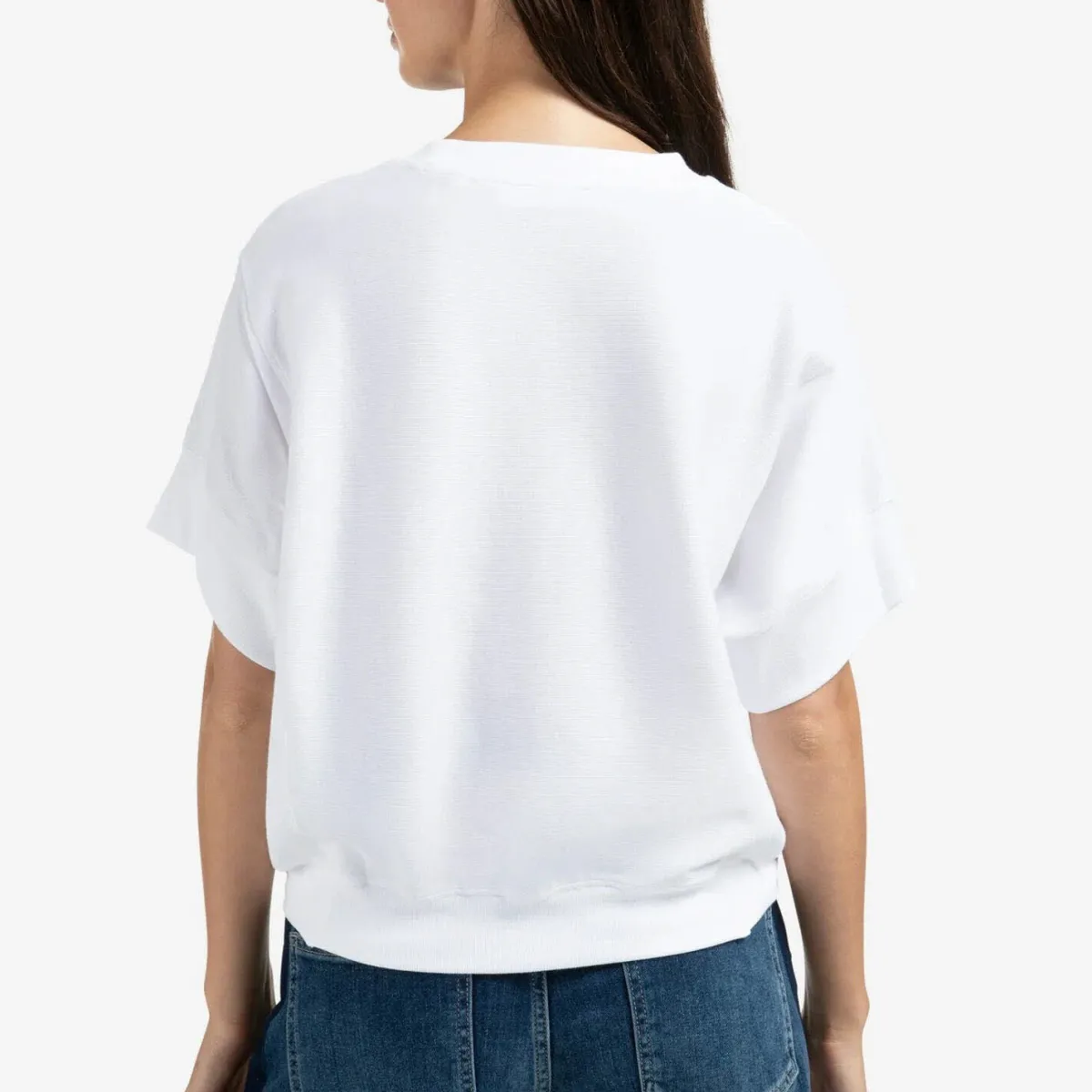 Es ist mit einem Rundhalsausschnitt gearbeitet, hat eine Oversize Passform und kurze Ärmel mit Rippstrickbund.