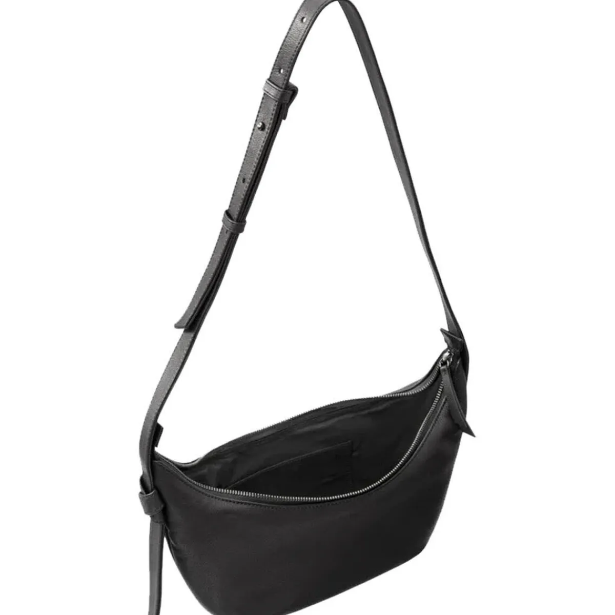Die Schultertasche ist in eleganter Halbmondform aus geschmeidigem Leder in Schwarz gearbeitet und verstaut alle Dinge auf die du im Alltag nicht verzichten möchtest.