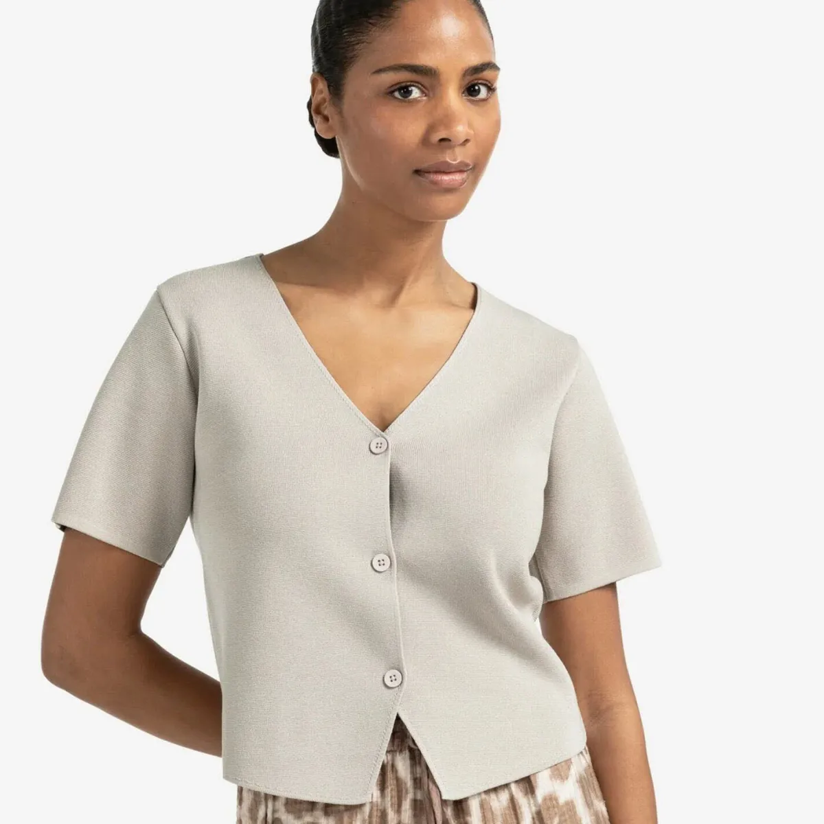 Dazu passend der V-Ausschnitt und die Knopfleiste. Es hat eine enge Passform und kann super einzeln oder im Lagenlook getragen werden.
