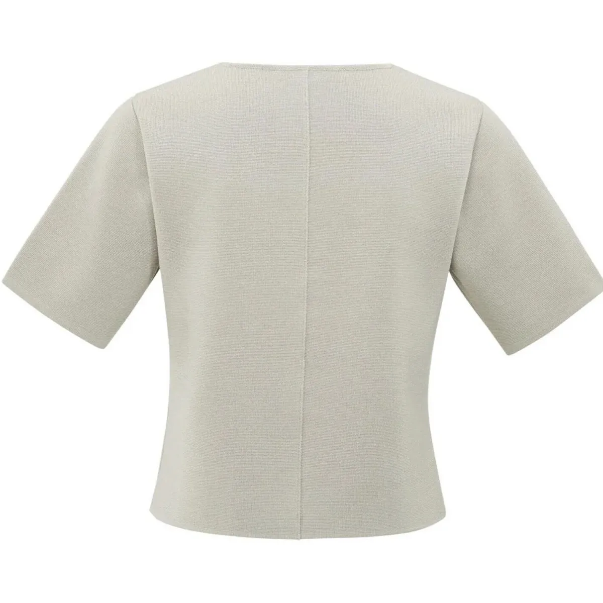 Es wurde aus einem Strickmaterial in Beige gefertigt und wirkt optisch wie eine Weste, als Besondheit dazu die kurzen Ärmel.