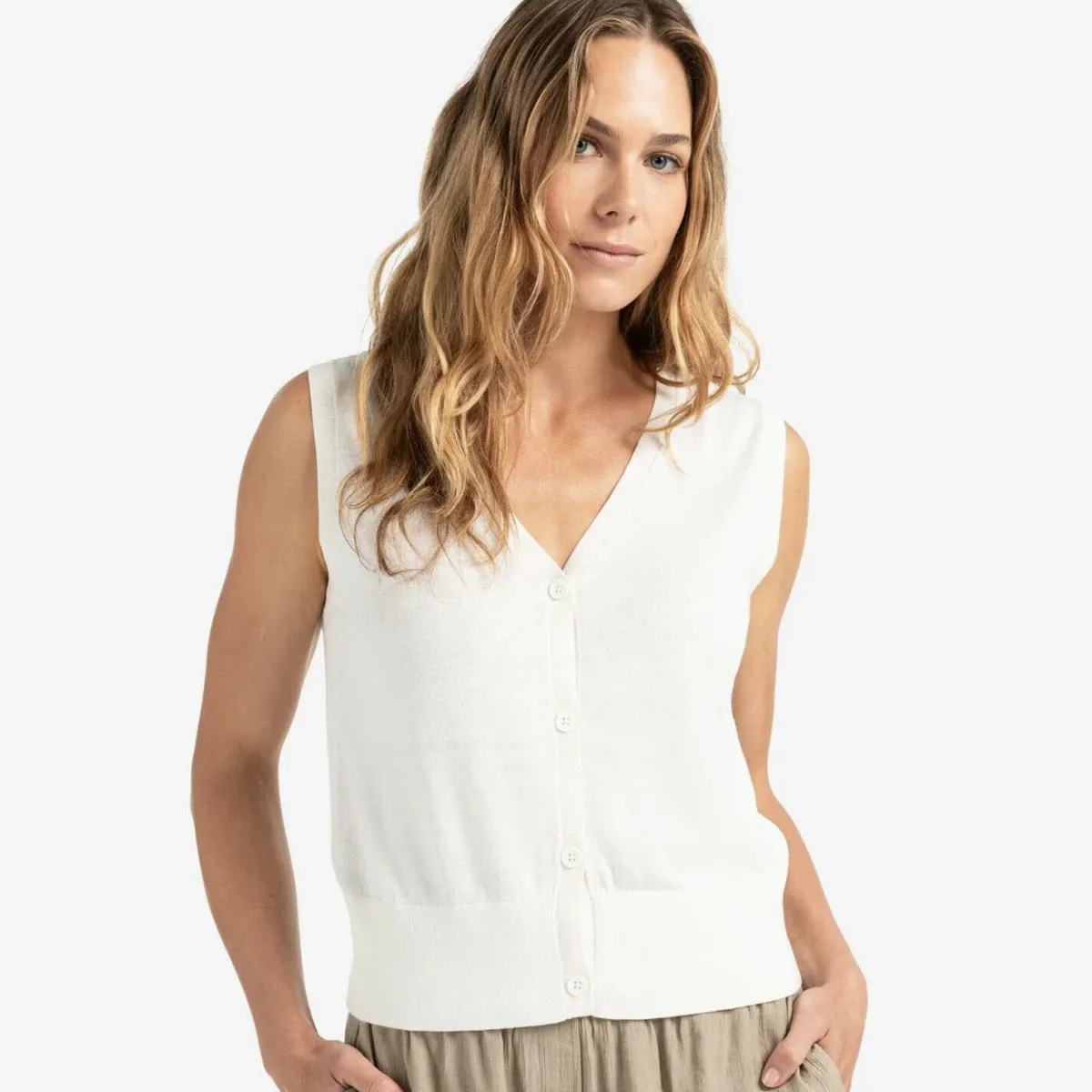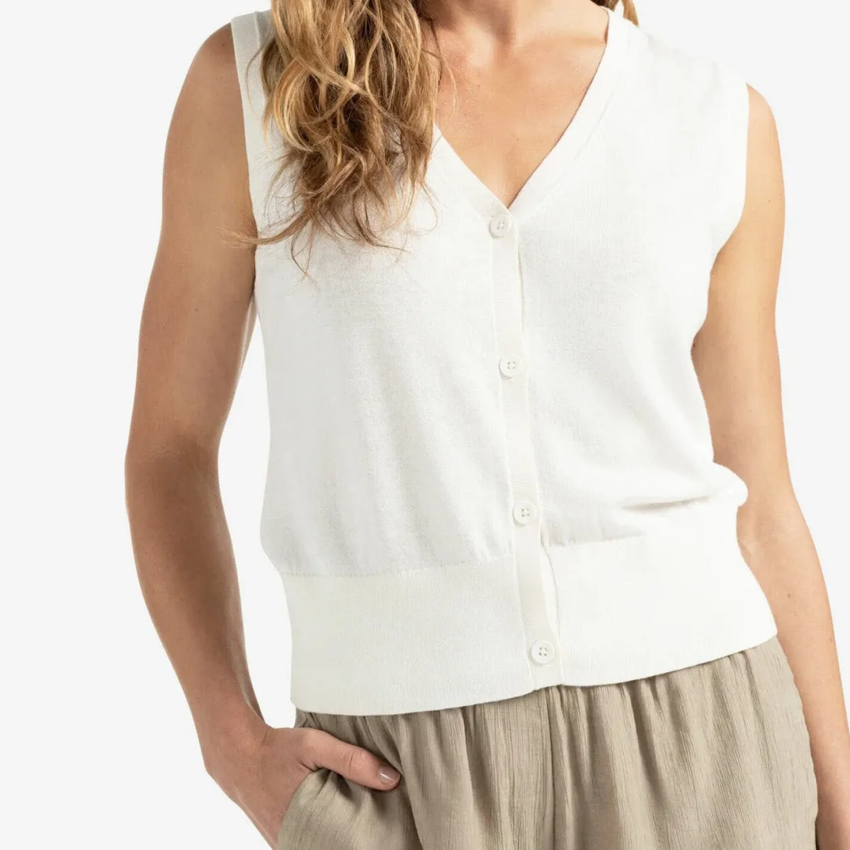 Das Feinstrick Gewebe in Weiß ist mit einem V-Ausschnitt und einer durchgehenden Knopfleiste gearbeitet.