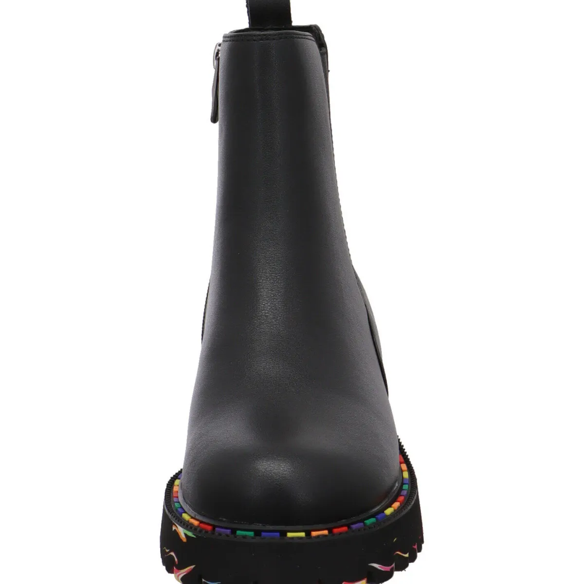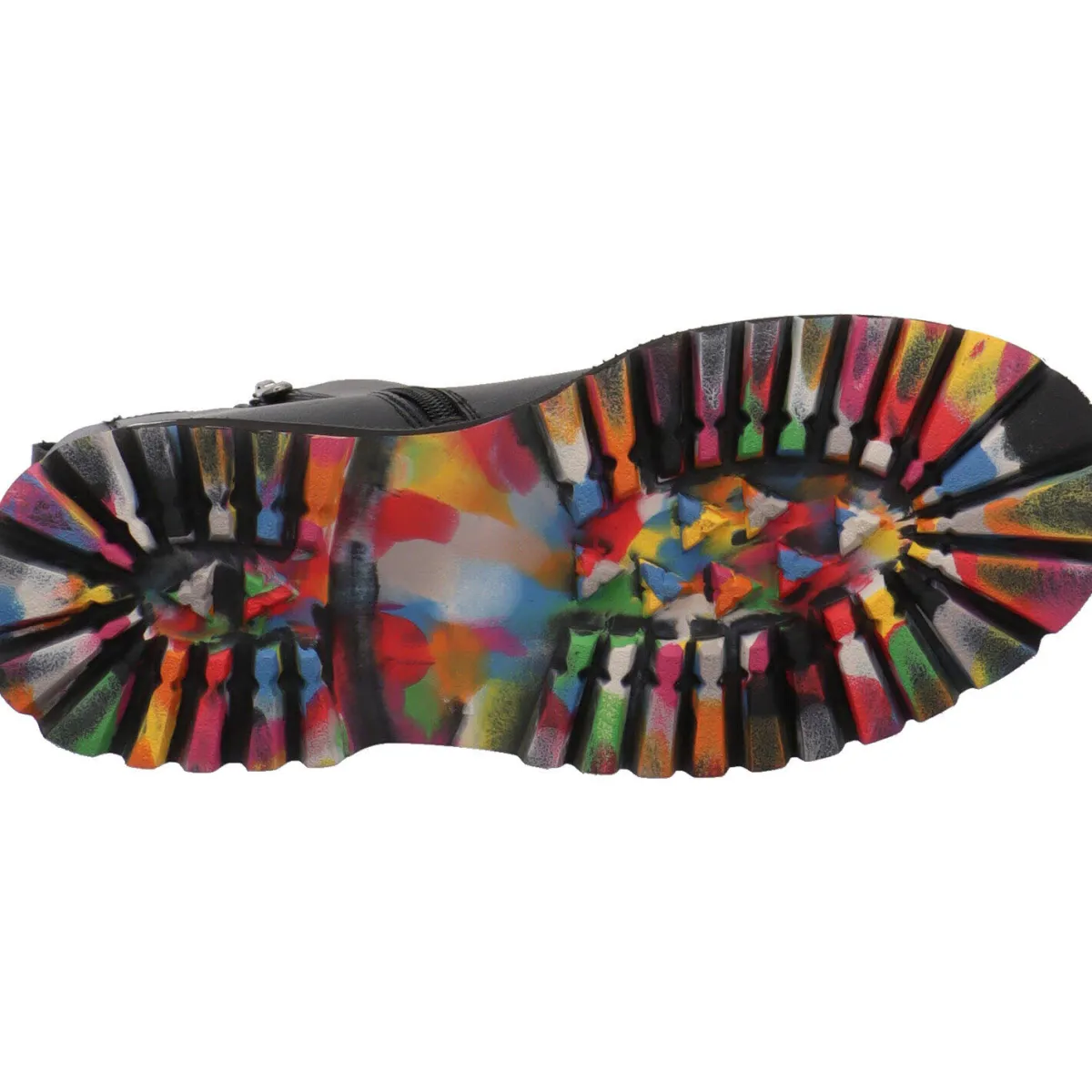 Er wurde aus hochwertigem Echtleder in Schwarz gefertigt. Absoluter Eyecatcher ist hierbei die bunte Umrandung der Laufsohle die sich in Farbtupfern in der Laufsohle wiederfindet. Mit dem seitlichen Reißverschluss und dem Gummipanel, ist das An- und Ausziehen ganz einfach. Eine Zierschnalle an der Rückseite vom Schaft rundet dem modischen Look gekonnt ab.