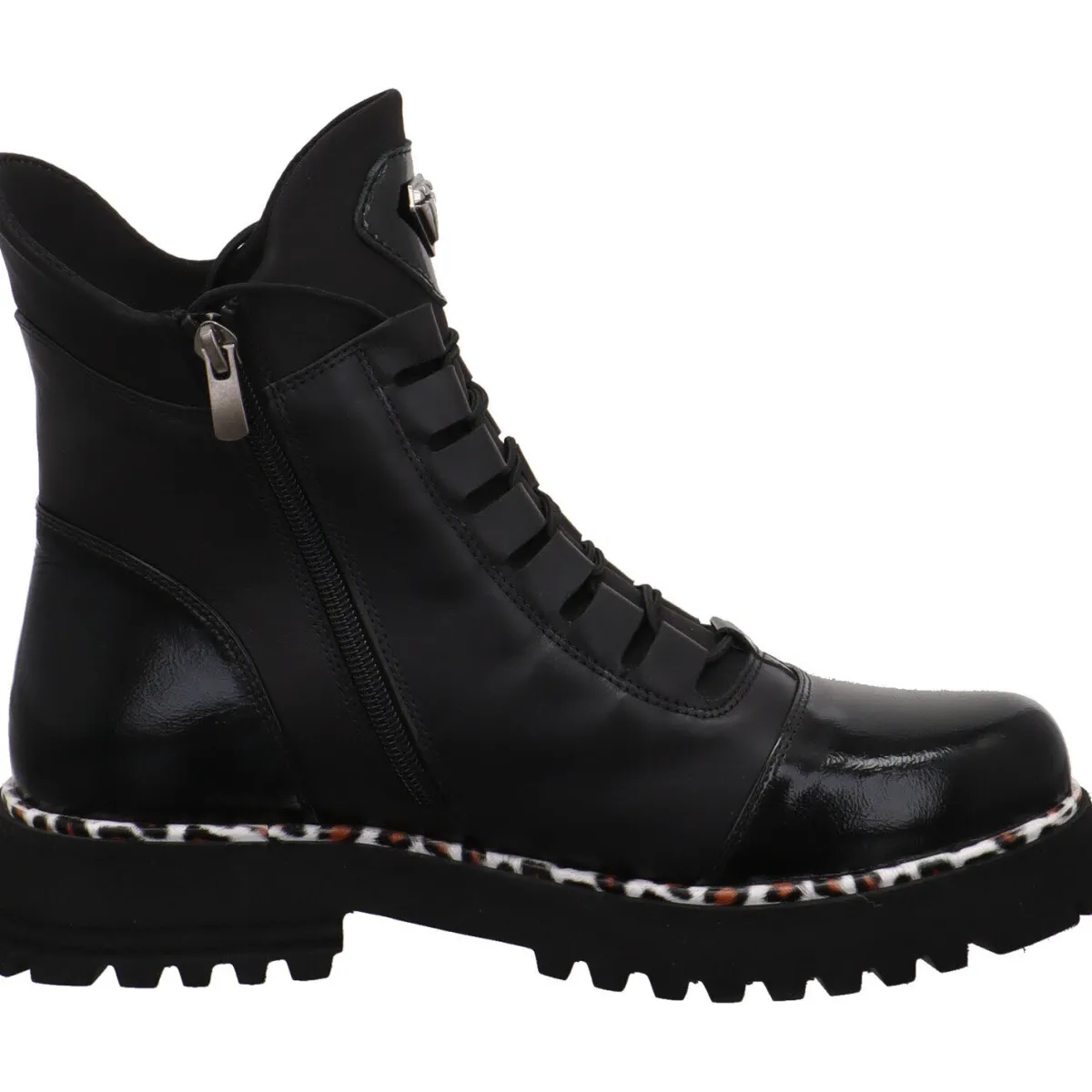 Er wurde aus hochwertigem Echtleder in Schwarz gearbeitet und ist am der Schuhspitze und Fersenkappe mit einem Lack Einsatz versehen. Der Schaft hat eine besondere Linienführung und ist mit einem Stretcheinsatz versehen. In Verbindung mit dem Reißverschluss ist der Ein- und Ausstieg ganz einfach. Durch die Gummischnürung kann er genau auf deine Bedürfnisse angepasst werden. Eyecatcher ist hier die Umrandung der Laufsohle mit einem Leo Animal Print.
