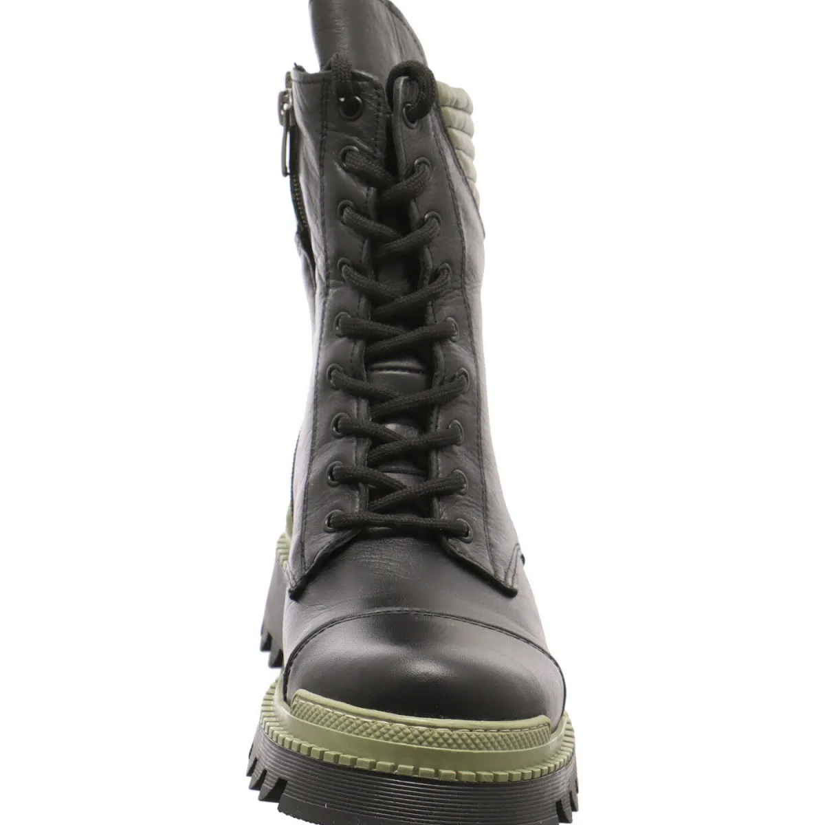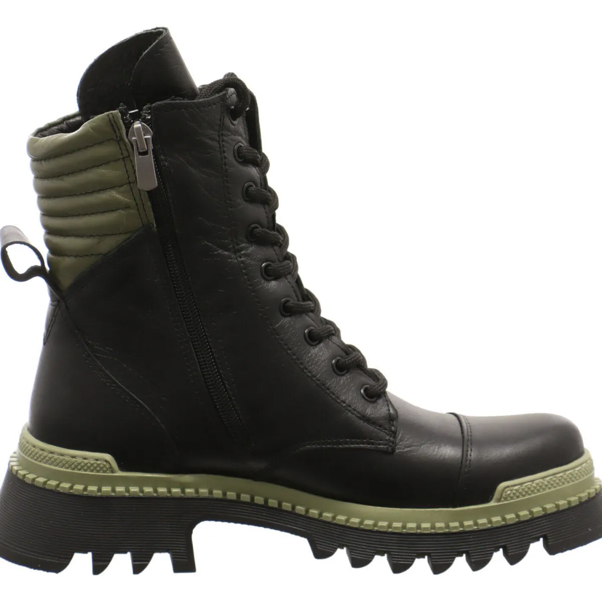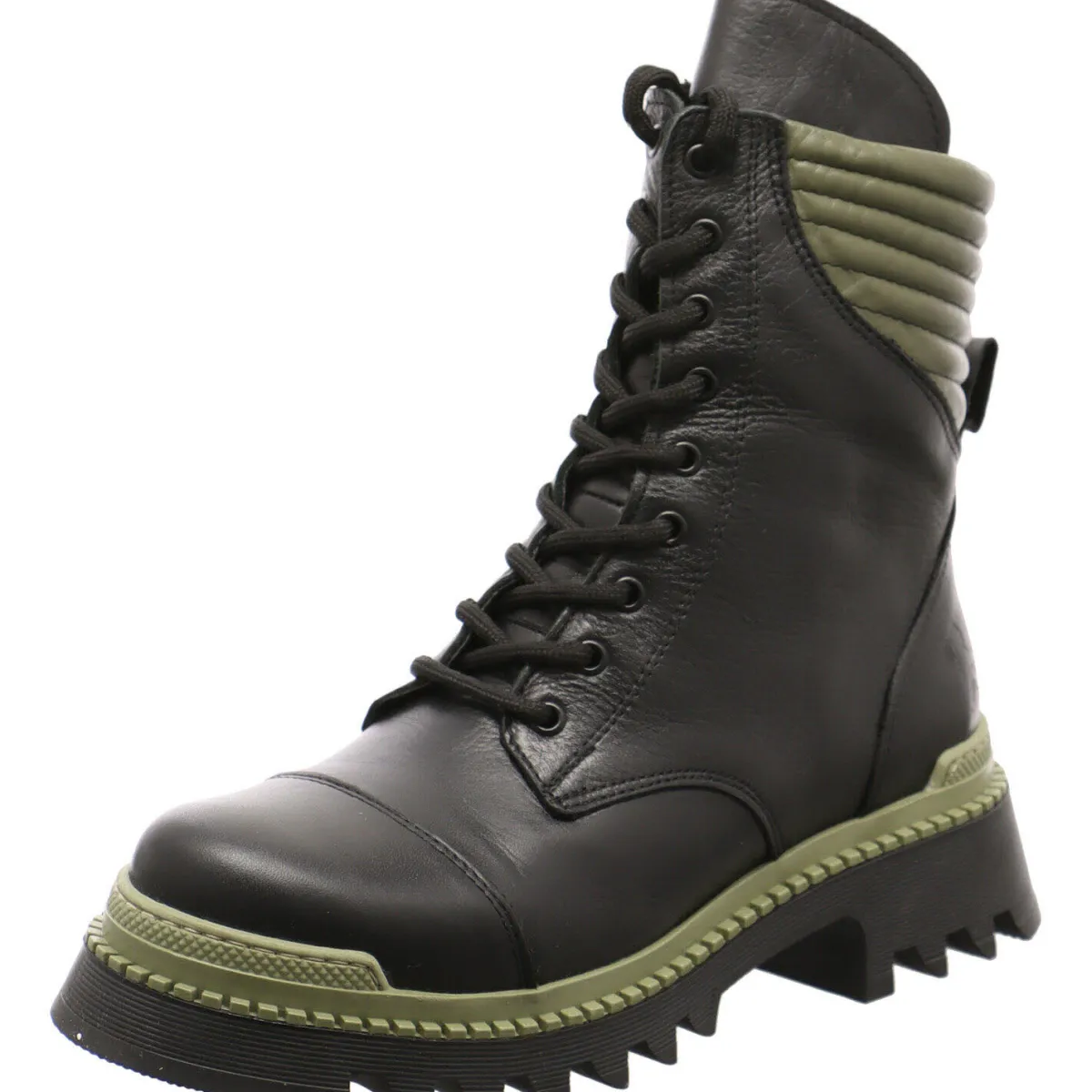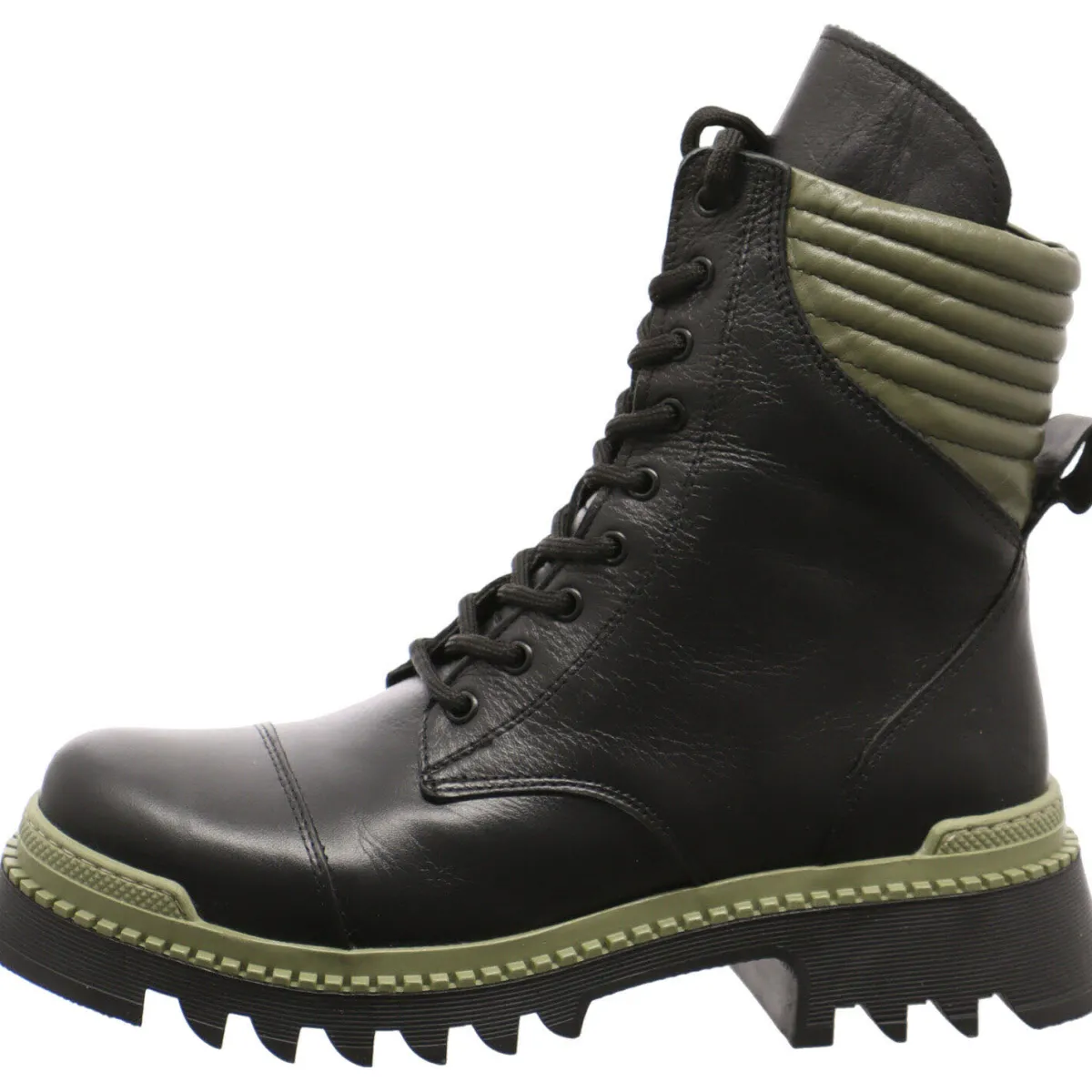 Gefertigt aus Echtleder in Schwarz, besticht der Schuh durch seine Akzente in Oliv Grün. Optische Highlights sind der markante Blockabsatz, die Lasche und der Einsatz am Schaft und die Umrandung der Laufsohle in Oliv Grün.