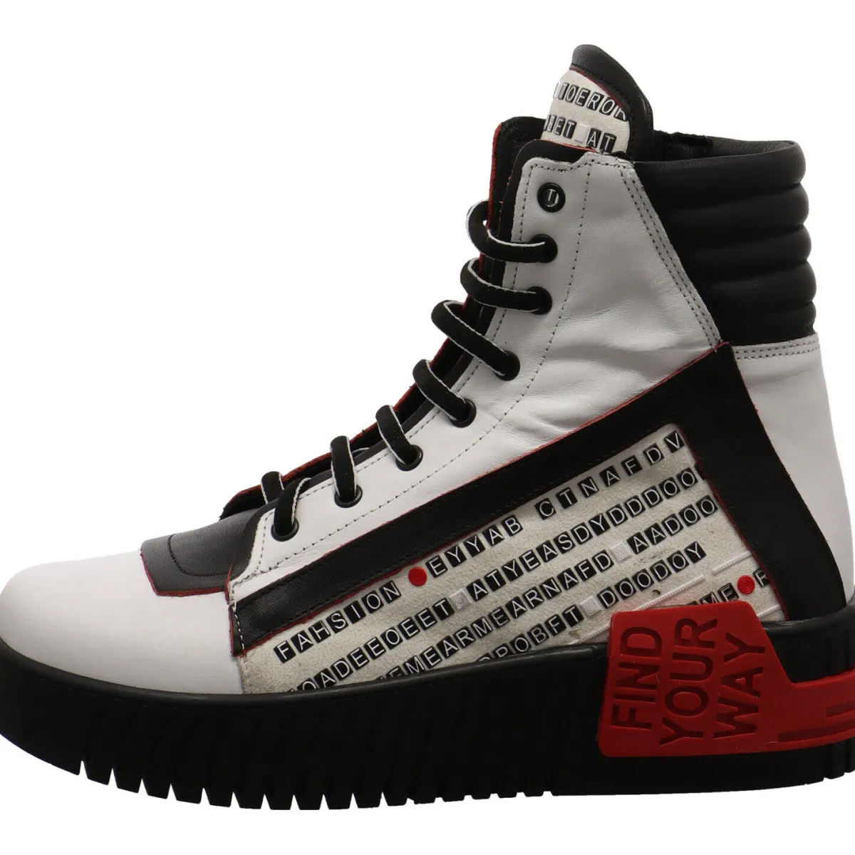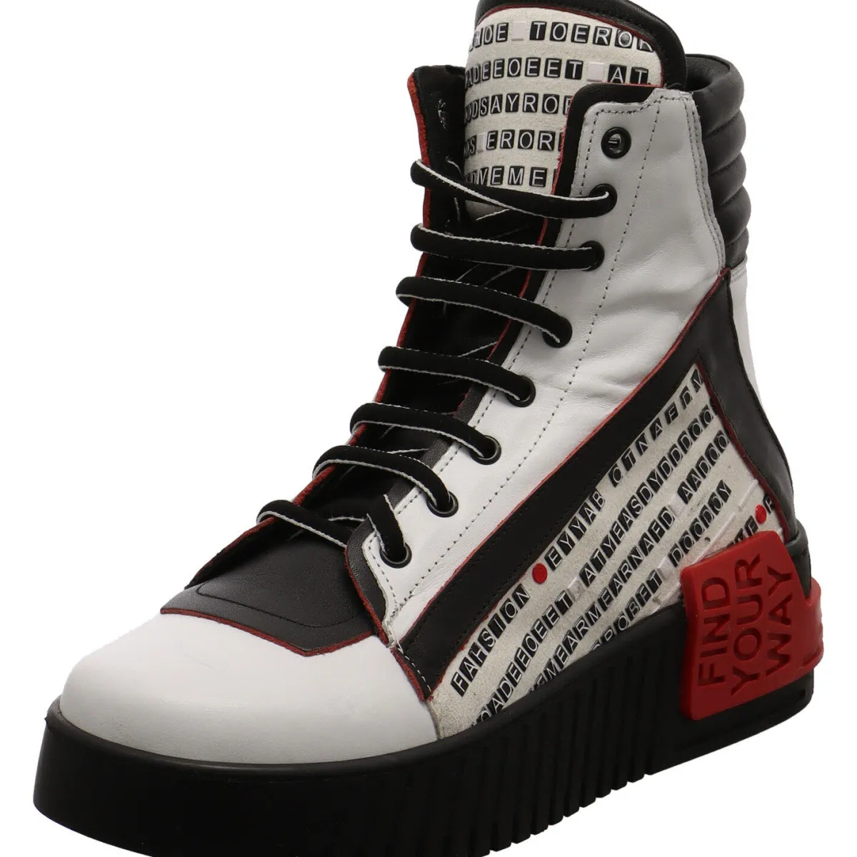 Das Obermaterial aus Glattleder in Weiß wird durch die Einsätze in Schwarz und den individuellen Print gekonnt in Szene gesetzt. Durch den seitlichen Reißverschluss und die Schnürung, ist ein leichter Einstieg möglich.
