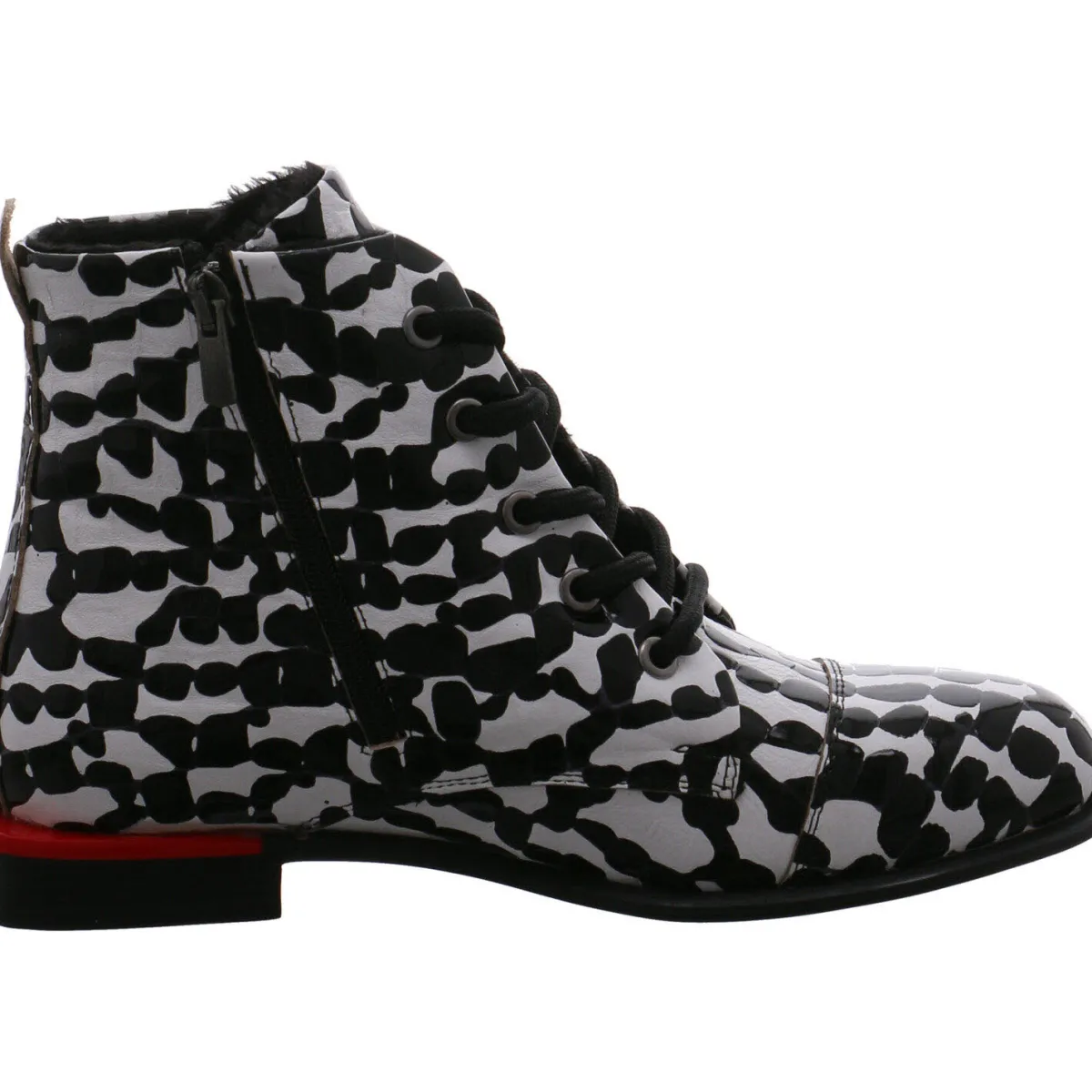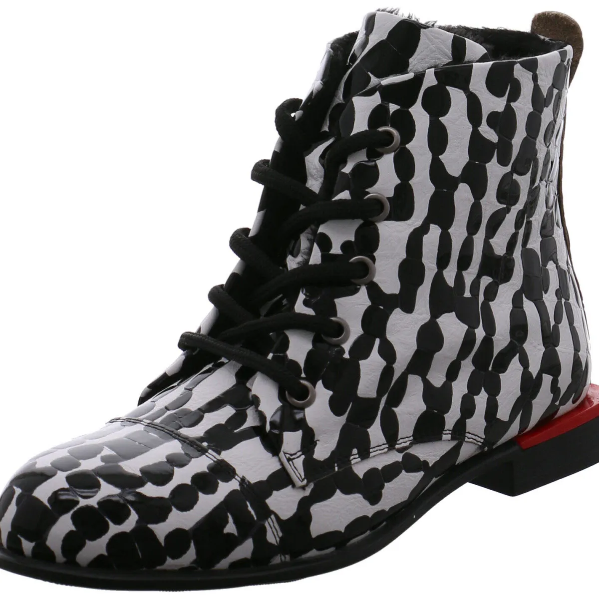 Gefertigt aus Echtleder in Weiß und Schwarz überzeugt sie mit Ihrem auffälligen Look. Ein besonderes optisches Highlight ist auch der Streifen in Rot am Absatz.