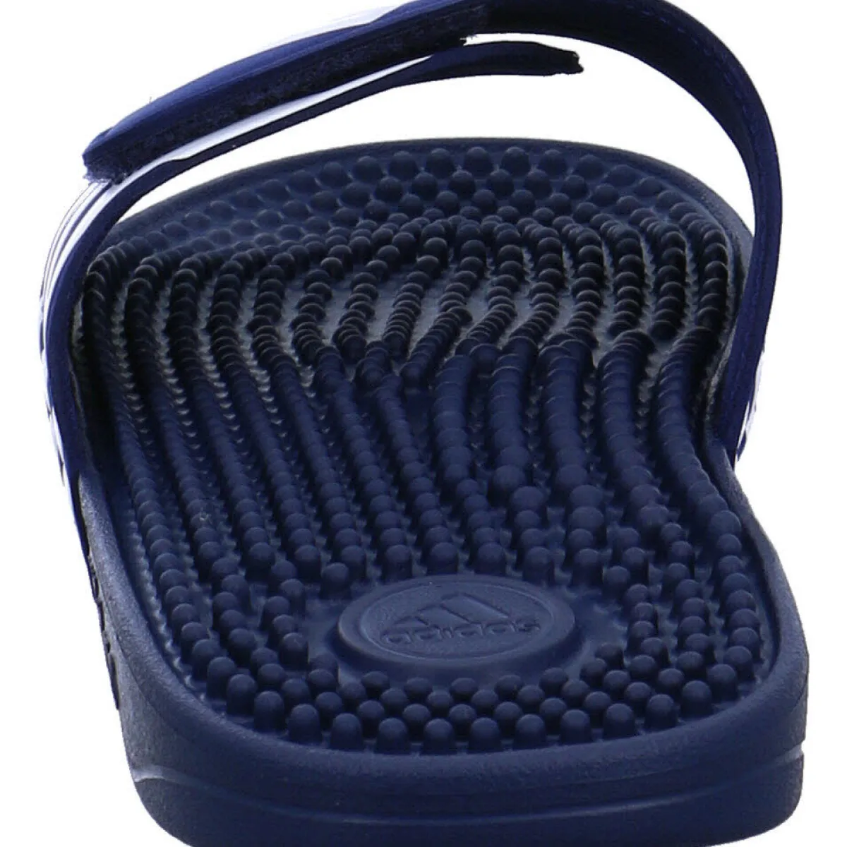 Das synthetische Obermaterial in Navy Blau trocknet sehr schnell und durch den Klettverschluss lässt sich die Badepantolette optimal an den Fuß anpassen.