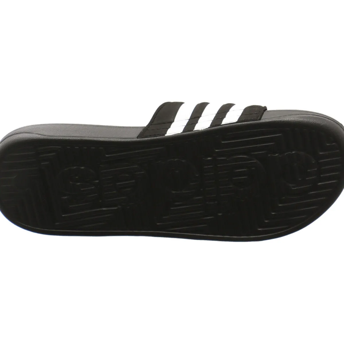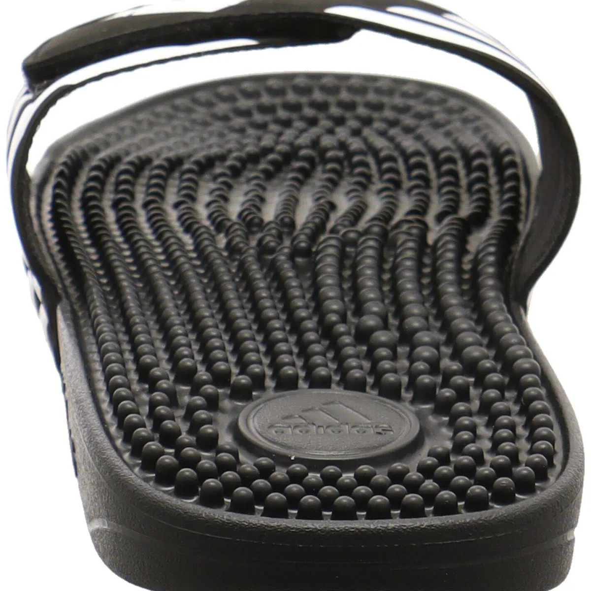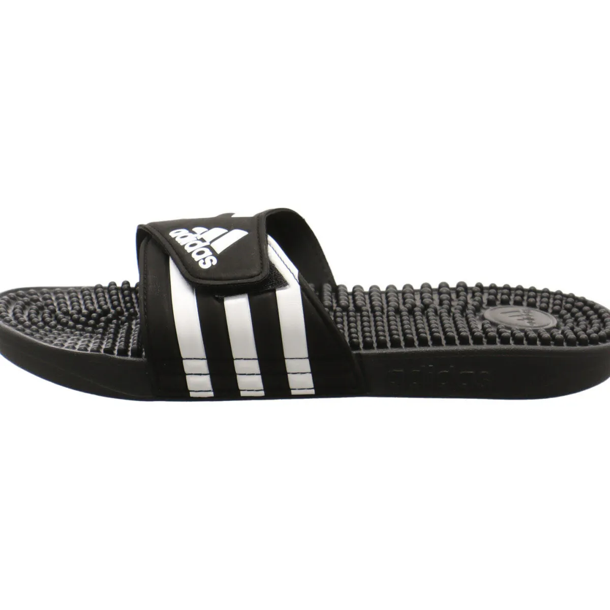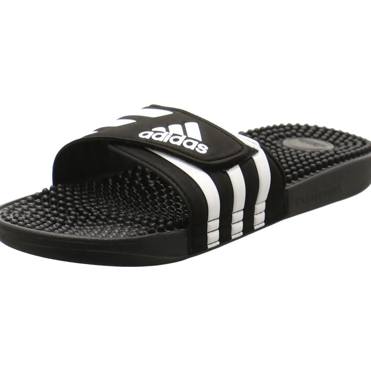 Das synthetische Obermaterial in Schwarz trocknet sehr schnell und durch den Klettverschluss lässt sich die Badepantolette optimal an den Fuß anpassen.