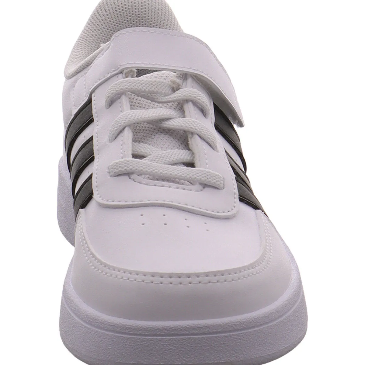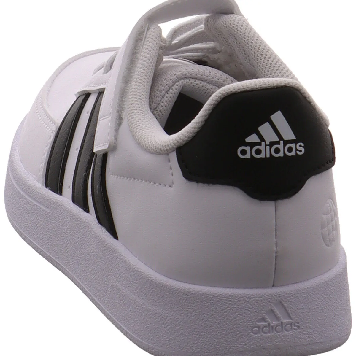 Das Obermaterial aus pflegeleichtem Kunstleder in klassischem Weiß lässt sich gut kombinieren und wird durch die seitlichen drei Streifen und die Fersenkappe in Schwarz optisch noch aufgewertet.