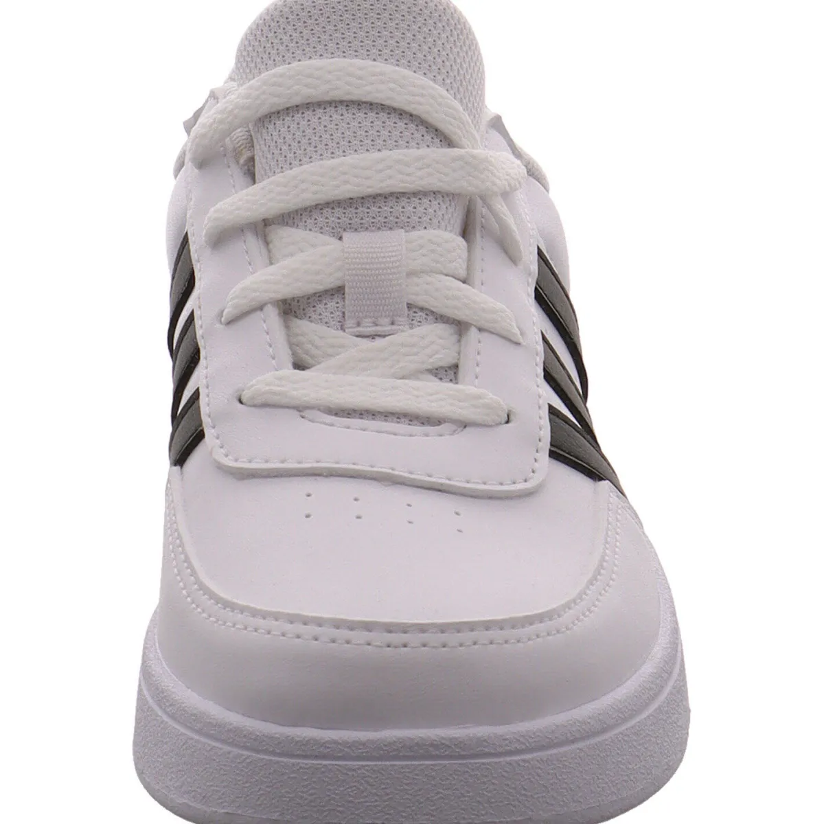 Das Obermaterial aus pflegeleichtem Kunstleder in klassischem Weiß, lässt sich gut kombinieren und wird durch die seitlichen drei Streifen und die Fersenkappe in Schwarz optisch noch aufgewertet.
